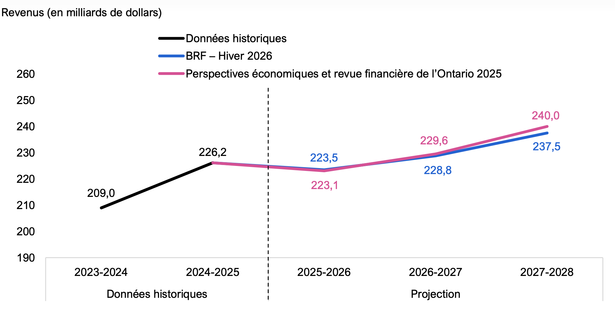 Par rapport aux prévisions du document Perspectives économiques et revue financière de l’Ontario 2025, les prévisions de revenus du BRF correspondent globalement à celles du gouvernement pour les deux premières années de la projection. Cependant, en 2027-2028, dernière année des perspectives du gouvernement, le BRF prévoit que les revenus seront inférieurs de 2,5 milliards de dollars à ceux prévus par le gouvernement, principalement en raison de ses prévisions moins optimistes concernant les revenus provenant de l’impôt sur le revenu des particuliers.
