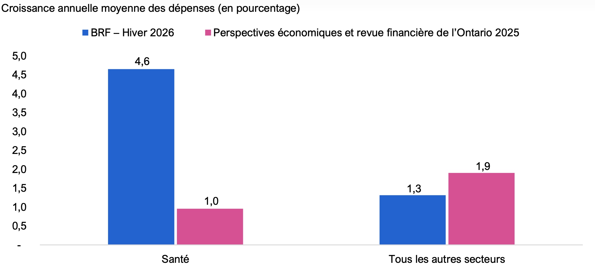 Par rapport au document Perspectives économiques et revue financière de l’Ontario 2025, les prévisions de dépenses établies par le BRF correspondent à celles du gouvernement pour 2025-2026, mais dépassent celles du gouvernement pour 2026-2027 et 2027-2028, respectivement de 5,2 milliards et 8,2 milliards de dollars. L’écart entre les prévisions de dépenses s’explique en grande partie par les prévisions de dépenses plus élevées du BRF dans le secteur de la santé, lesquelles devraient augmenter en moyenne de 4,6 % par an selon le BRF. En comparaison, le document Perspectives économiques et revue financière de l’Ontario 2025 prévoit une augmentation annuelle moyenne de 1,0 % des dépenses dans le secteur de la santé. Cette différence se traduit par une insuffisance de financement de 10,7 milliards de dollars dans le secteur de la santé en 2027-2028. Pour l’ensemble des autres secteurs, les prévisions de dépenses du BRF sont inférieures à celles de la province, en grande partie en raison du fonds de prévoyance. Il en résulte un excédent de financement prévu de 2,5 milliards de dollars pour tous les autres secteurs en 2027-2028, qui pourrait être utilisé pour combler en partie l’insuffisance de financement prévue dans le secteur de la santé.