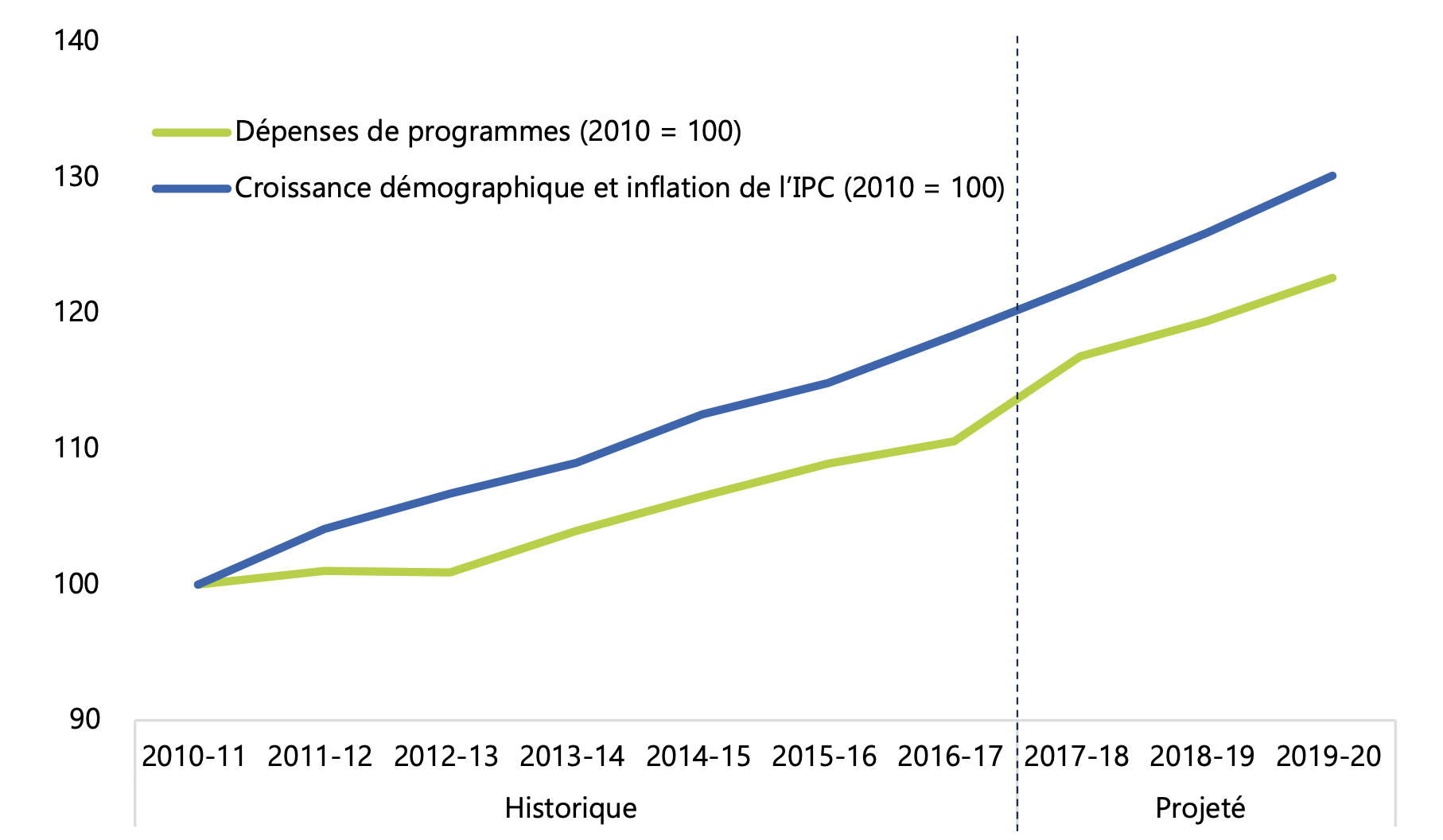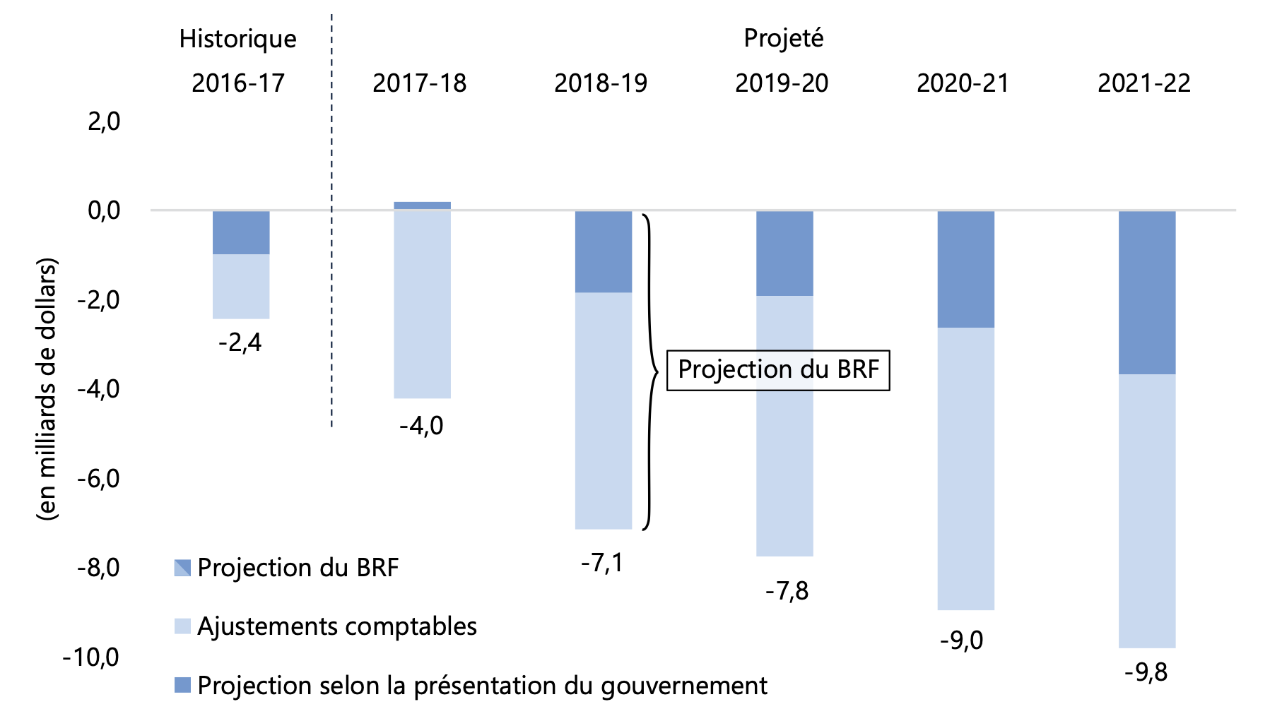 En comparaison, sur la base du cadre comptable du gouvernement, le BRF prévoit un excédent budgétaire modeste pour 2017-2018, et un retour des déficits à partir de 2018-2019 en raison de la perte de revenus temporaires et d’un ralentissement de la croissance des revenus fiscaux.