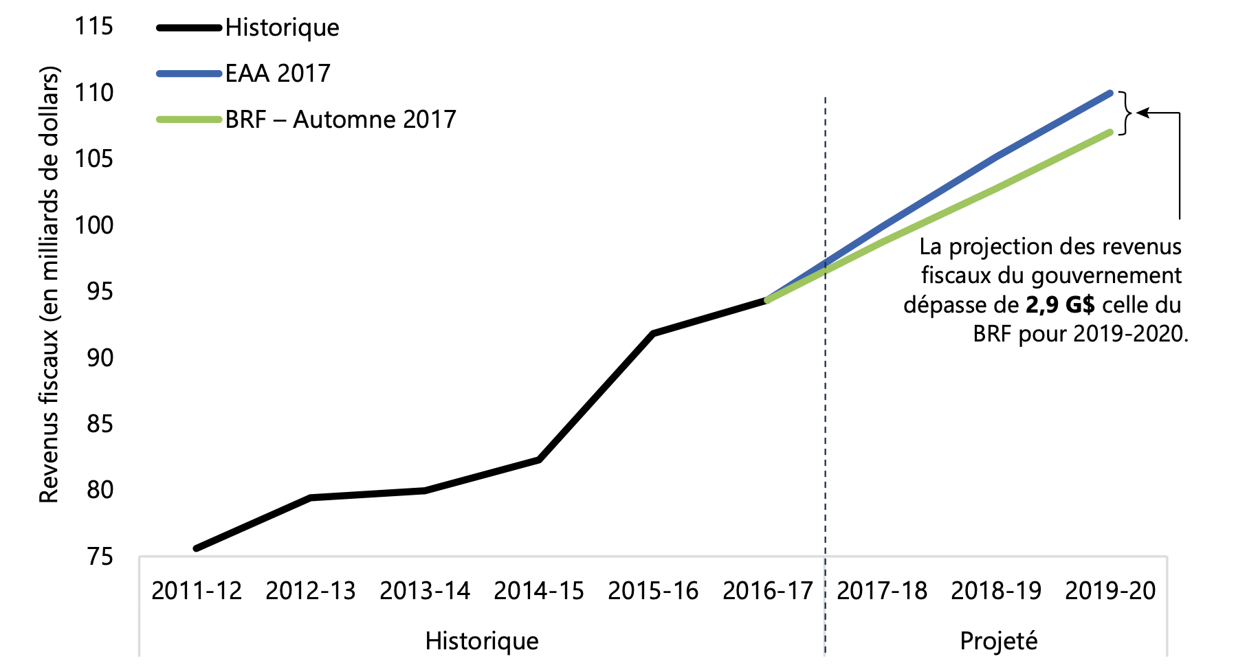 Dans son exposé annuel d’automne, le gouvernement prévoit une croissance moyenne de 5,2 % des revenus fiscaux de 2017-2018 à 2019-2020, ce qui est largement supérieur à la prévision du BRF, soit 4,3 % pour la même période. Ainsi, le gouvernement prévoit 2,9 G$ de plus que le BRF en revenus fiscaux d’ici 2019-2020.