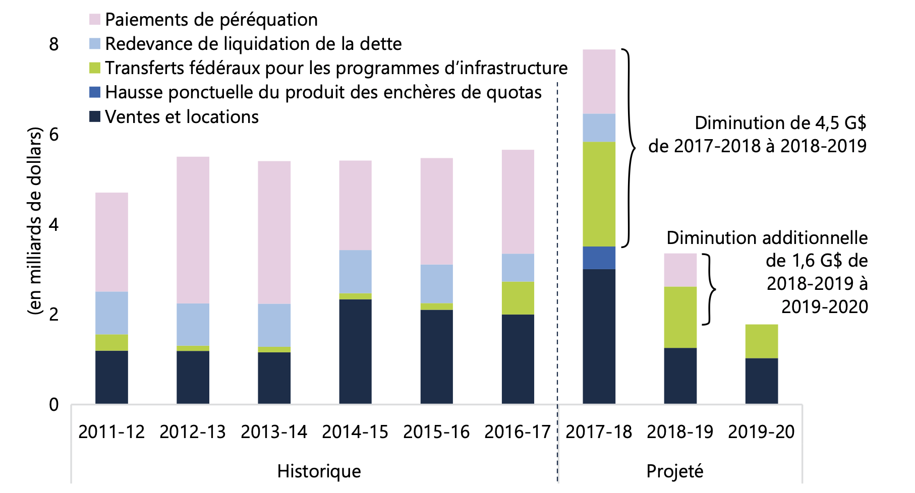 [15] Certains de ces revenus temporaires – notamment les recettes tirées de la vente de quotas d’émission de carbone ou des transferts fédéraux pour les infrastructures – sont rattachés à des dépenses planifiées, ce qui compense partiellement leur diminution.