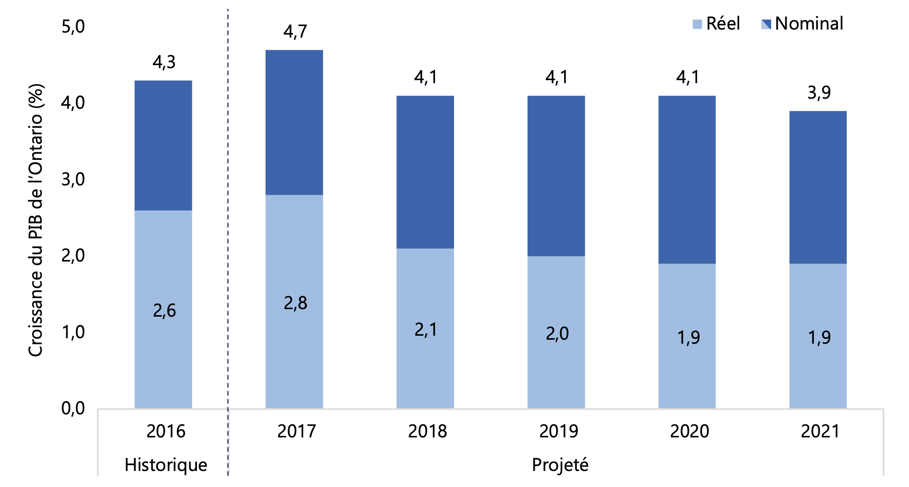 Vu l’augmentation soutenue des dépenses des ménages et des investissements résidentiels, le Bureau de la responsabilité financière (BRF) prévoit une croissance du PIB réel de l’Ontario de 2,8 % en 2017, révisant ainsi à la hausse ses prévisions du printemps. Le PIB nominal – la mesure la plus générale de l’assiette fiscale – devrait augmenter de 4,7 % en 2017, ce qui excède largement les prévisions du printemps et s’explique notamment par des gains importants au chapitre des bénéfices des sociétés.