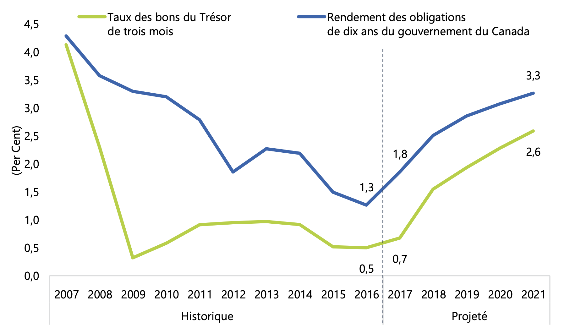 Ce graphique illustre le taux des bons du Trésor de trois mois et le rendement des obligations de dix ans du gouvernement du Canada, réels et projetés, de 2007 à 2021. Le taux des bons du Trésor de trois mois a diminué considérablement, passant de 4,1 % en 2007 à 0,5 % en 2016, mais il devrait augmenter légèrement pour se fixer à 0,7 % en 2017, puis continuer à grimper pour atteindre 2,6 % d’ici 2021. Le rendement des obligations de dix ans du gouvernement du Canada a également diminué, passant de 4,3 % en 2007 à 1,3 % en 2016, mais il devrait s’accroître pour se fixer à 1,8 % en 2017, puis continuer à augmenter pour atteindre 3,3 % d’ici 2021.