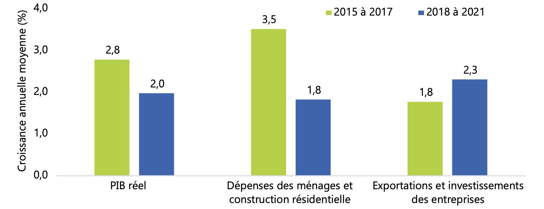 Ce graphique montre, pour les périodes de 2015 à 2017 et de 2018 à 2021, le taux de croissance moyen des trois indicateurs suivants : 1) PIB réel de l’Ontario, 2) dépenses des ménages et investissements résidentiels, et 3) exportations et investissements des entreprises. La croissance du PIB réel devrait ralentir, passant de 2,8 % entre 2015 et 2017 à 2,0 % entre 2018 et 2021. La croissance des dépenses des ménages et des investissements résidentiels devrait chuter, passant d’une moyenne de 3,5 % entre 2015 et 2017 à 2,0 % entre 2018 et 2021. Celle des exportations et des investissements des entreprises devrait augmenter, passant de 1,8 % entre 2015 et 2017 à 2,3 % entre 2018 et 2021.