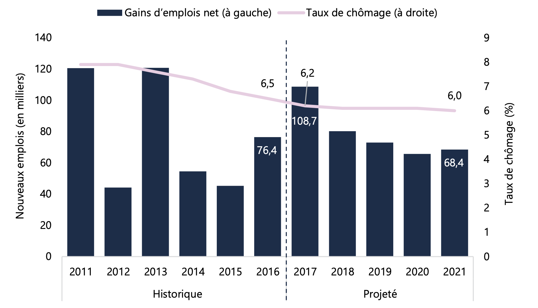 Ce graphique montre le nombre historique et projeté de gains nets d’emplois et l’évolution du taux de chômage de 2011 à 2021. On y constate que le taux de chômage diminue depuis 2011, et que cette tendance devrait se poursuivre. En effet, il devrait passer de 6,5 % en 2016 à 6,2 % en 2017, puis à 6,0 % d’ici 2021. Les gains nets d’emplois devraient s’élever à 108 700 en 2017, comparativement à 76 400 en 2016. On s’attend ensuite à ce que l’emploi continue de progresser tout au long de la période à l’étude, mais de façon graduellement plus modérée, avec un gain de 68 400 emplois d’ici 2021.