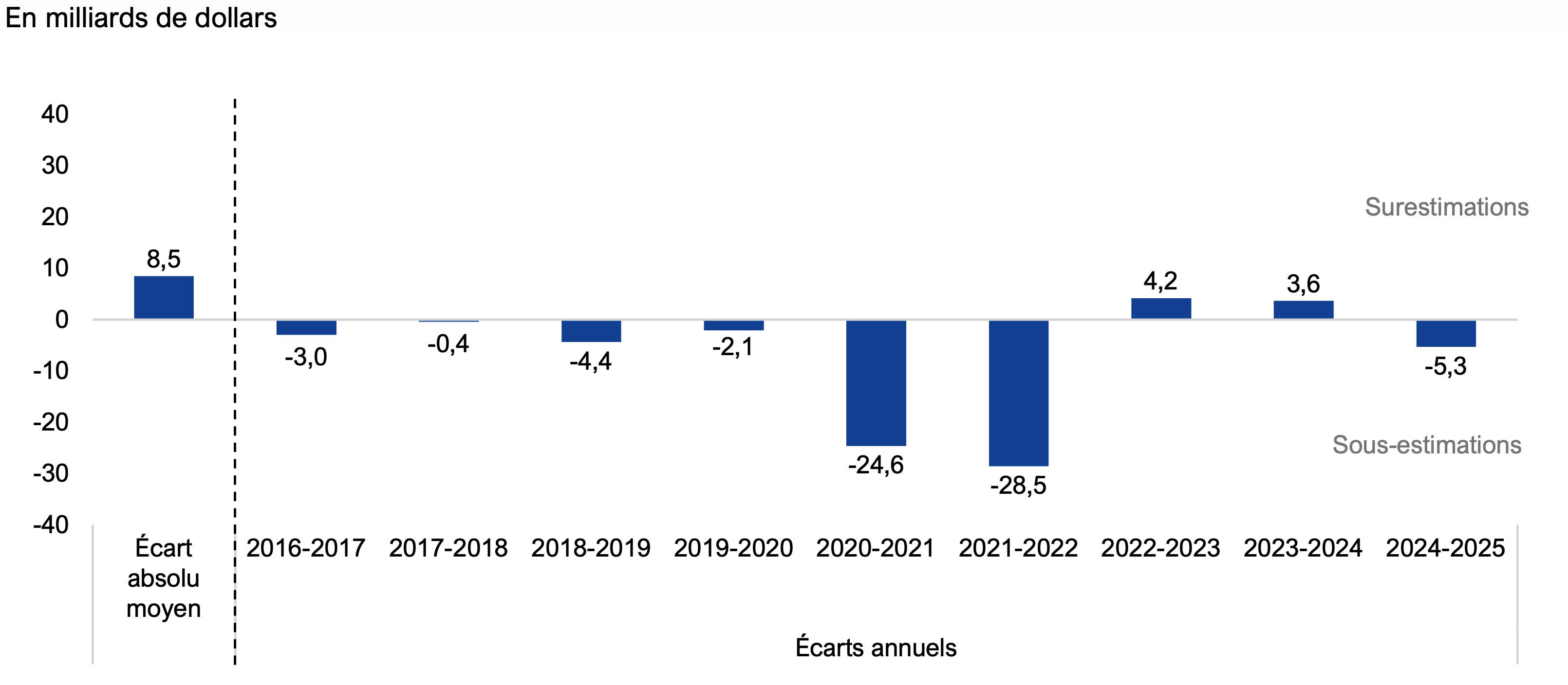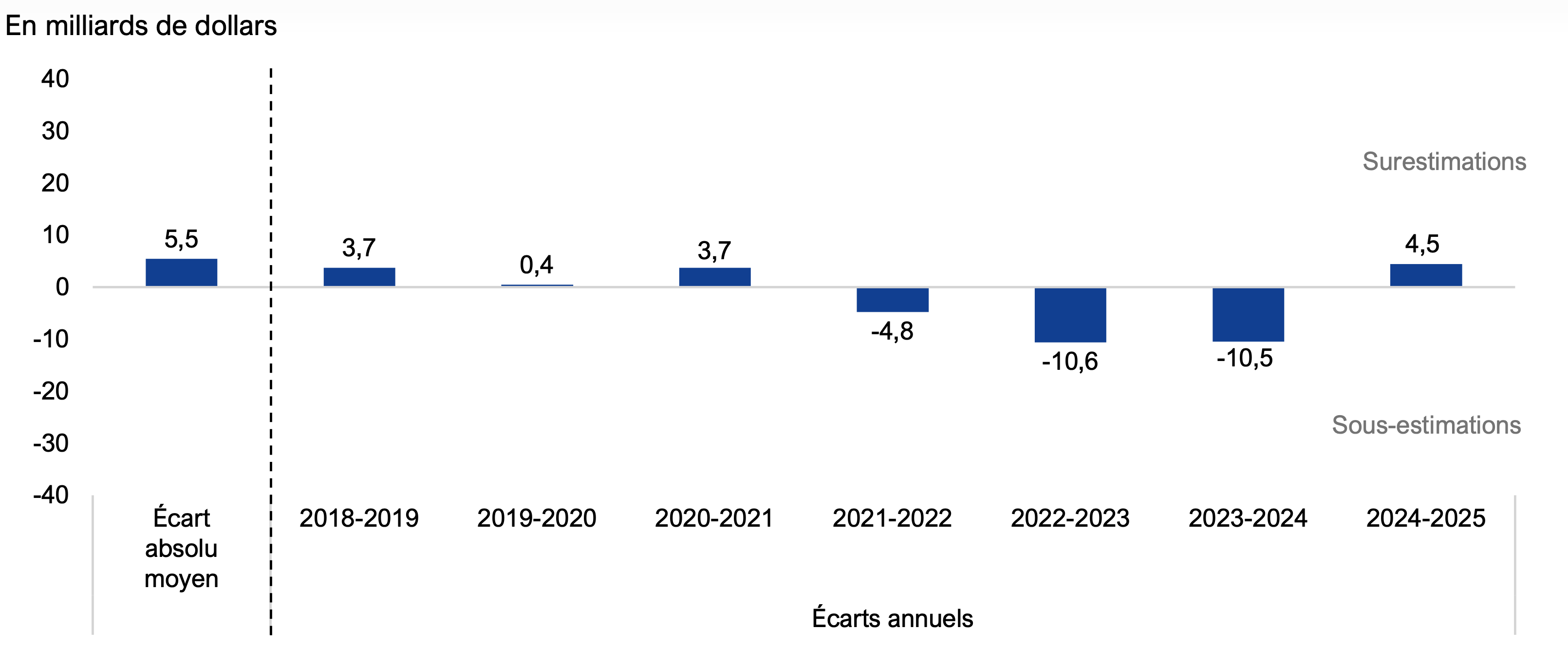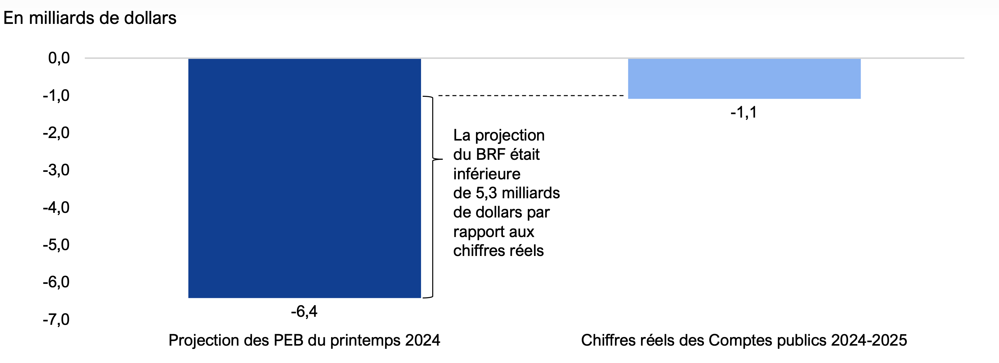 L’exactitude de la projection du solde budgétaire établie par le BRF dépend de la précision des projections de revenus et de dépenses que le BRF a faites. Pour l’exercice 2024‑2025, la projection de revenus que le BRF a publiée dans le document PEB du printemps 2024 était inférieure de 15,2 milliards de dollars par rapport aux résultats réels publiés dans les Comptes publics 2024‑2025 et la projection de dépenses était inférieure de 9,9 milliards de dollars par rapport aux résultats réels. Mises ensemble, ces sous-estimations se compensent partiellement et entraînent une sous-estimation de 5,3 milliards de dollars du solde budgétaire.