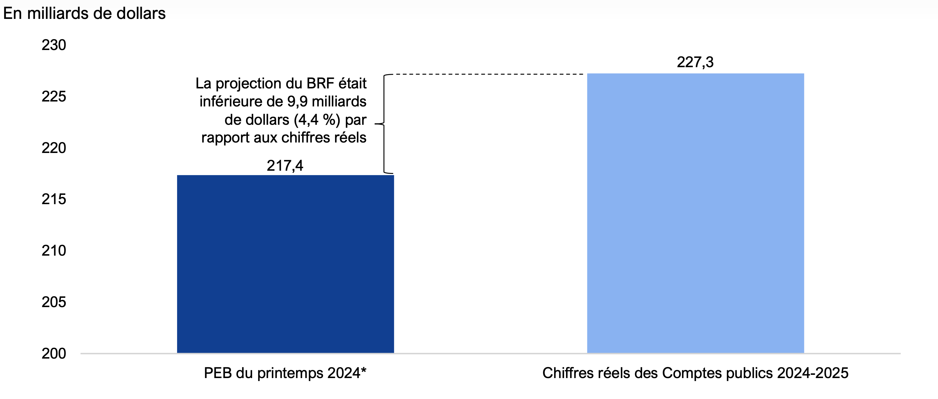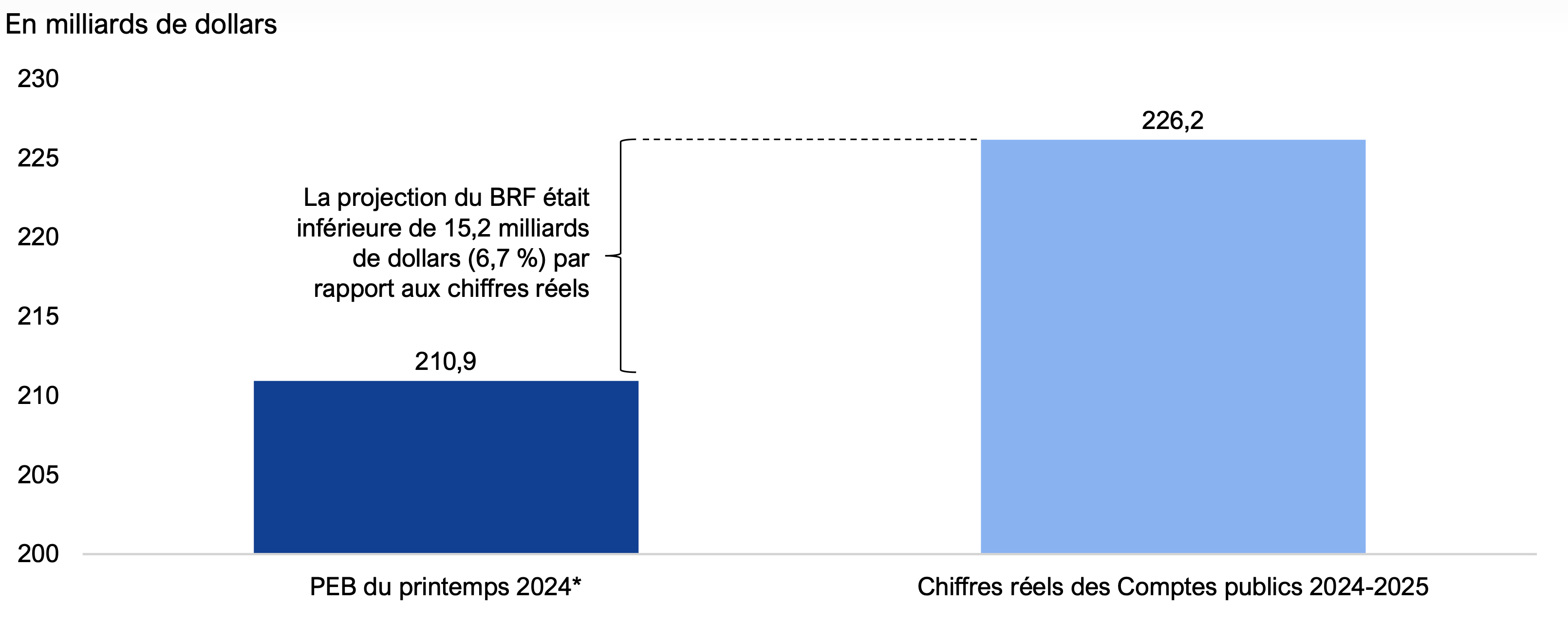 Dans le document PEB du printemps 2024, le BRF prévoyait des revenus totaux de 210,9 milliards de dollars[2] en 2024‑2025, soit 15,2 milliards de dollars (6,7 %) de moins que les chiffres réels pour les revenus totaux, qui s’élevaient à 226,2 milliards de dollars.
