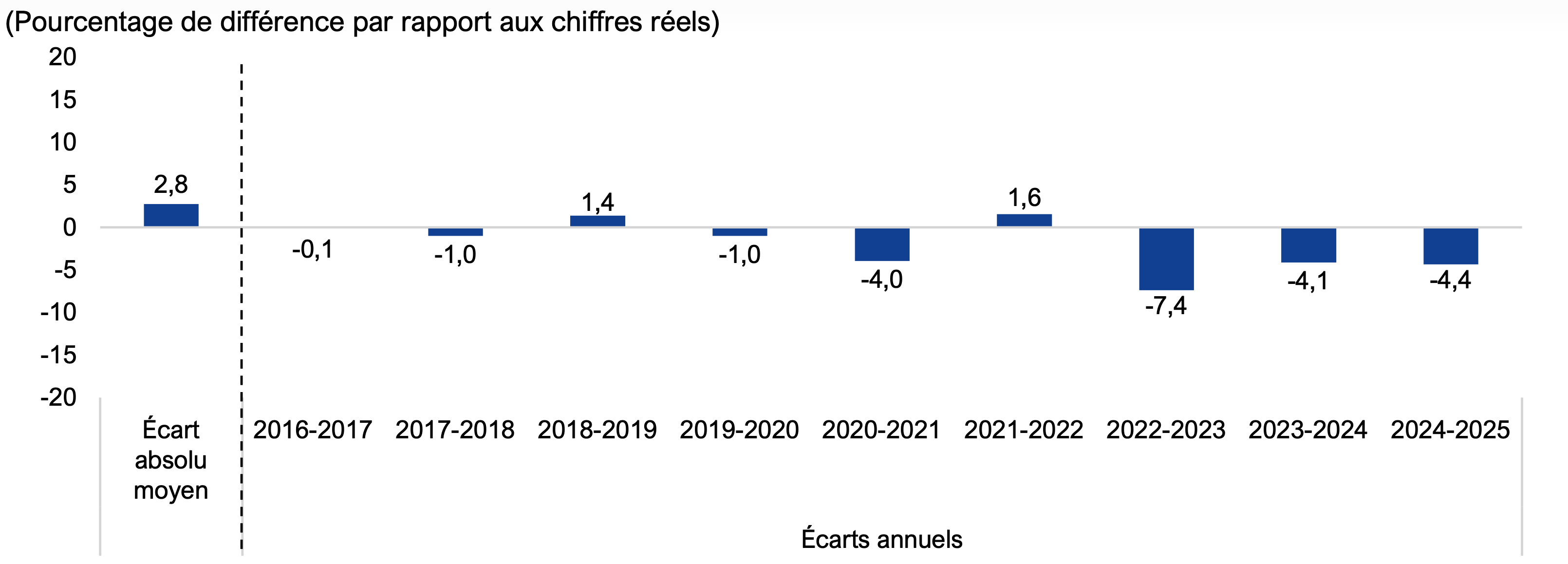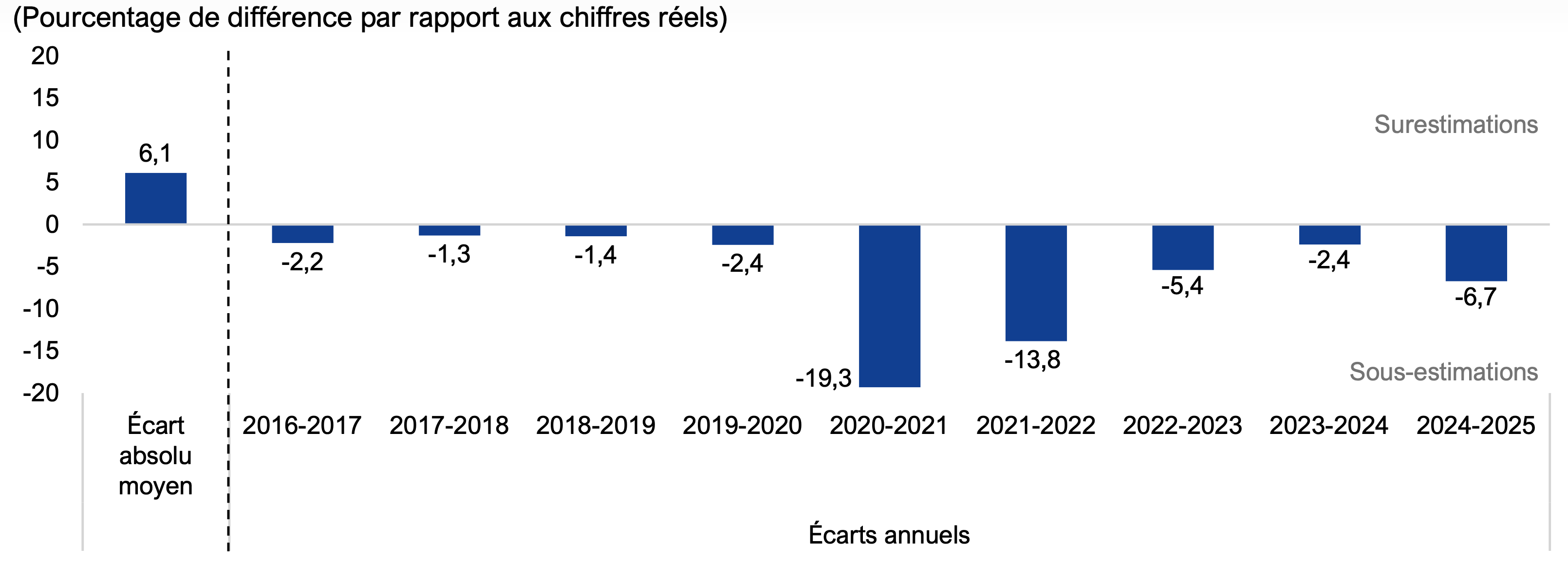 Les écarts absolus moyens des prévisions du BRF et du gouvernement de 2016‑2017 à 2024‑2025 ont été largement tributaires de la pandémie qui a sévi de 2020‑2021 et 2021‑2022.