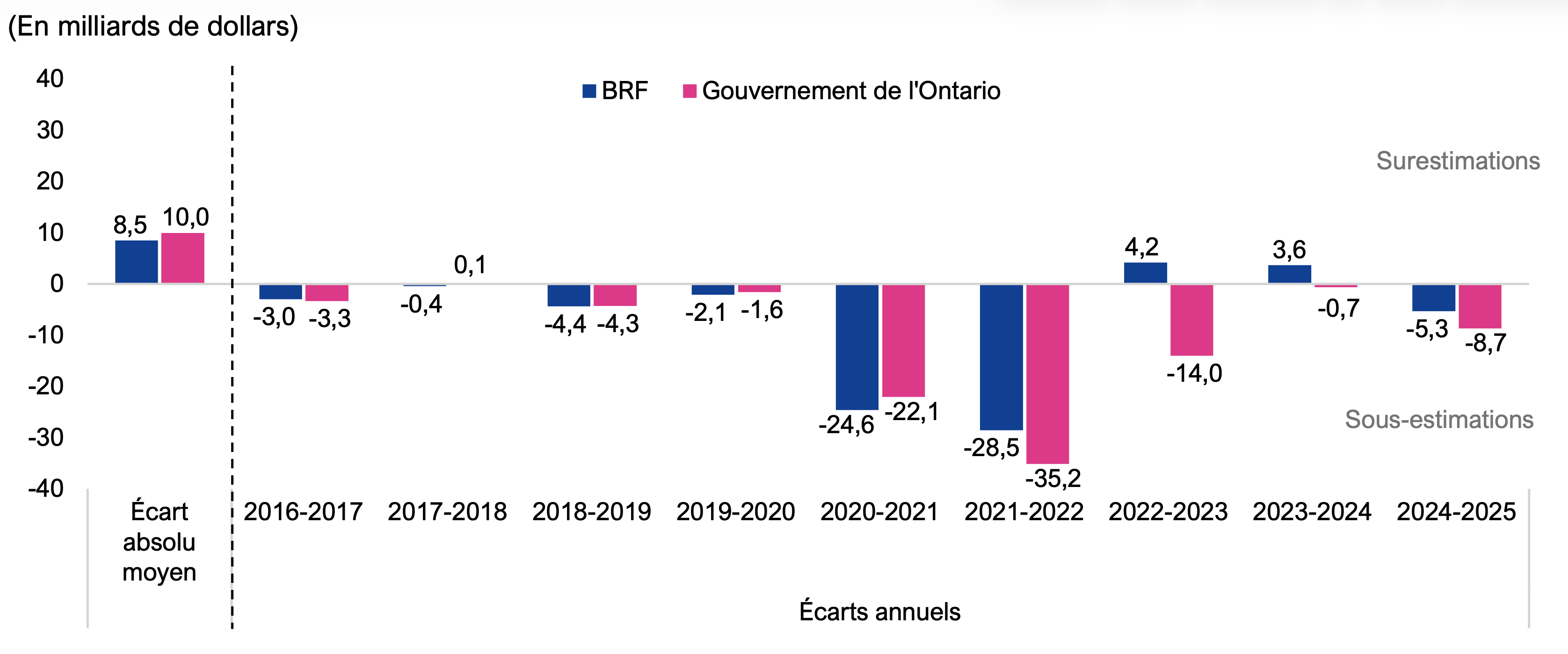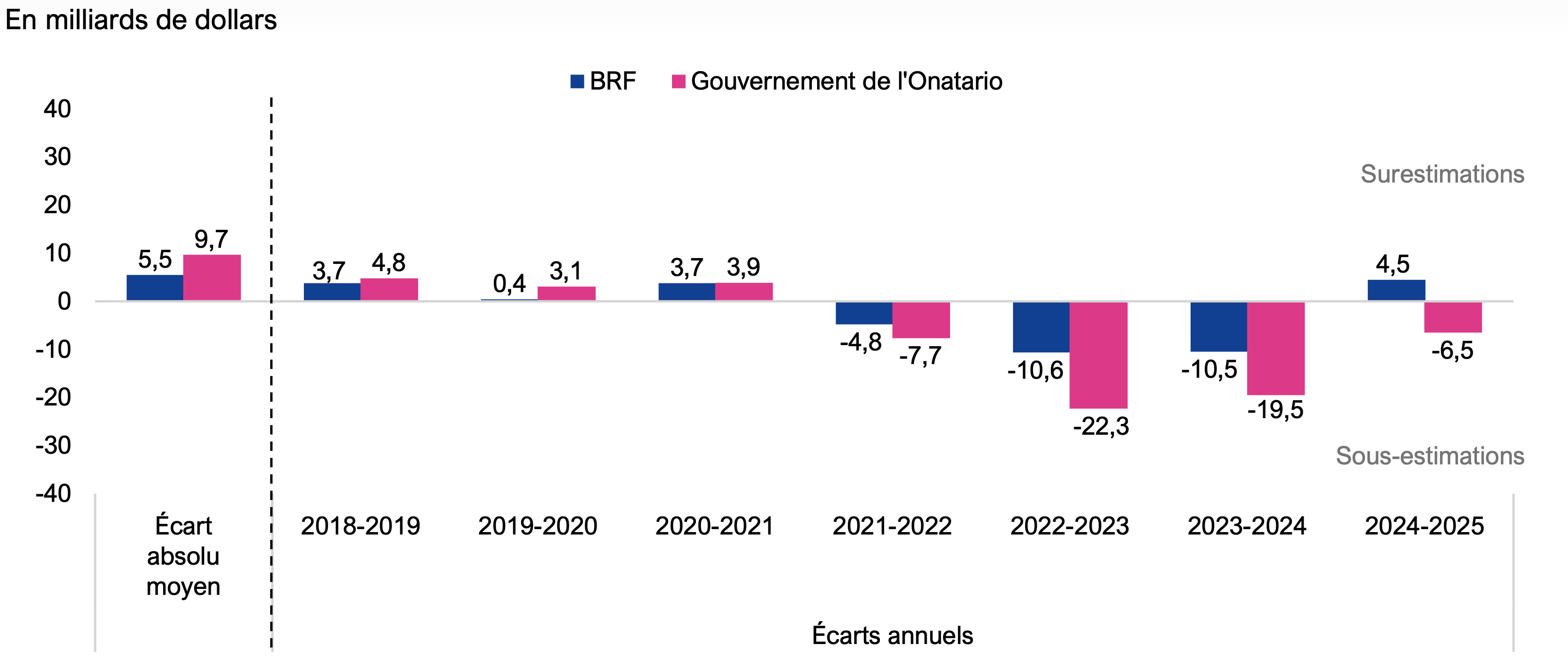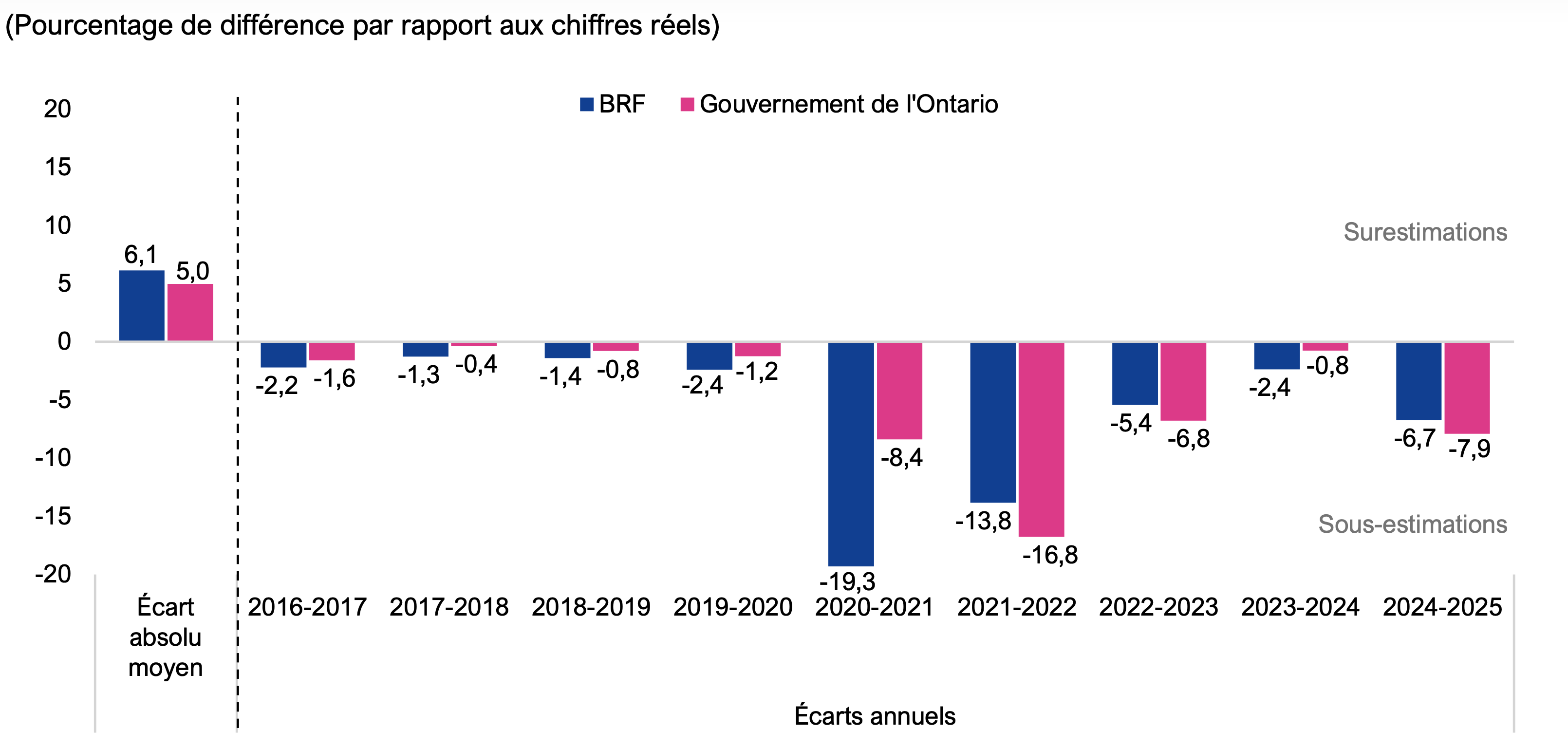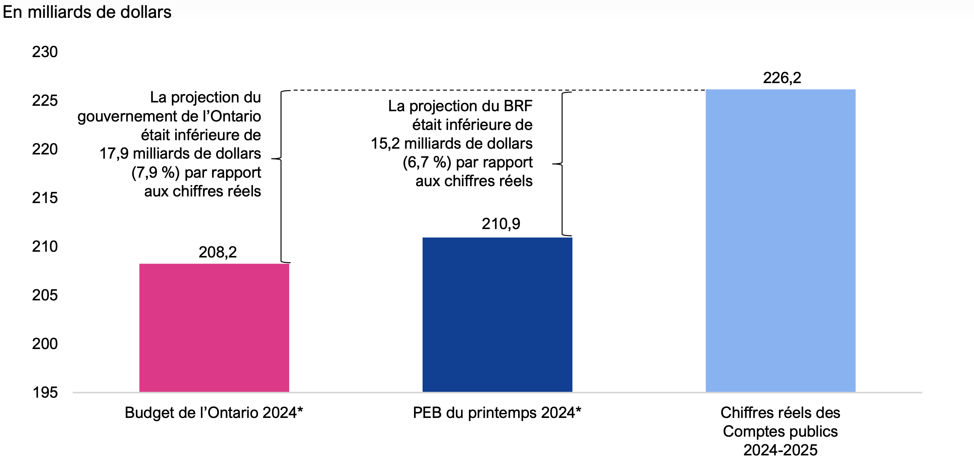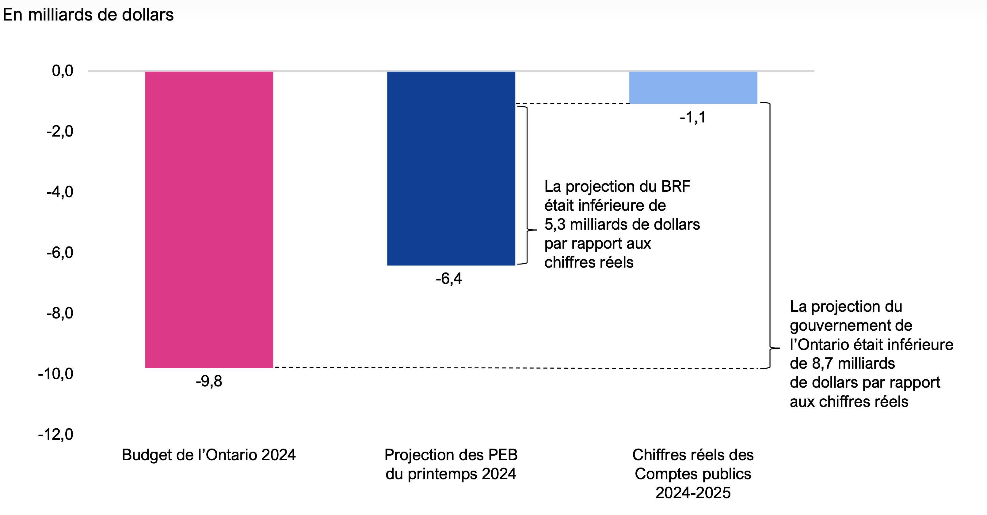Dans les PEB du printemps 2024, le BRF prévoyait un déficit budgétaire inférieur de 6,4 milliards de dollars pour 2024‑2025, soit une différence de 5,3 milliards de dollars par rapport au déficit budgétaire réel de 1,1 milliard de dollars publié dans les Comptes publics de l’Ontario 2024‑2025.