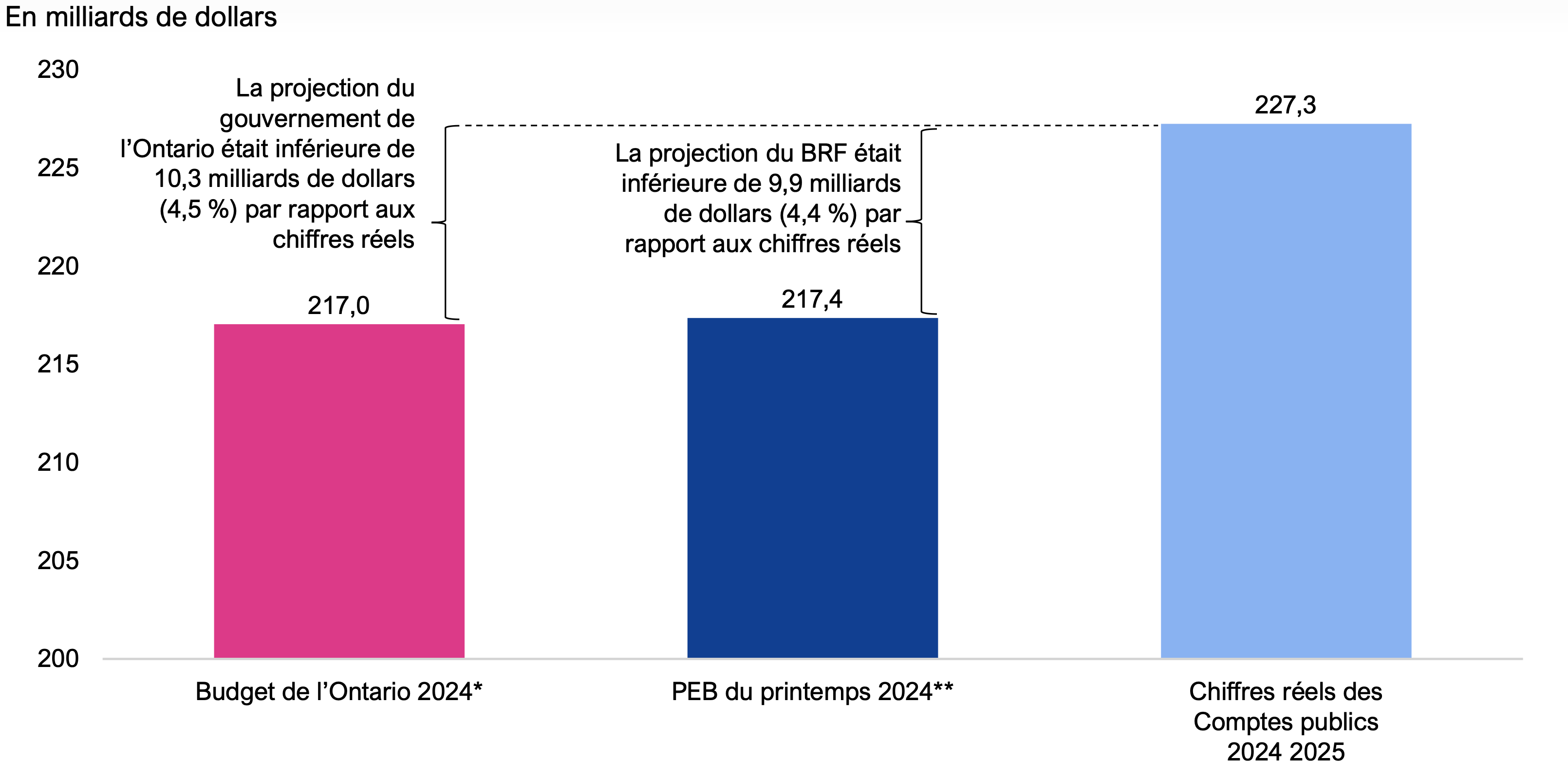 Tableau 3.1 Prévisions du document PEB du printemps 2024 du BRF et chiffres réels des Comptes publics 2024‑2025, en milliards de dollars Remarque : Les projections de revenus et de dépenses que le BRF a publiées dans le document PEB du printemps 2024 ont été retraitées pour tenir compte d’un changement comptable apporté aux revenus d’intérêts et de placement qui a été introduit dans les Comptes publics de l’Ontario 2024‑2025. Sources : Perspectives économiques et budgétaires, printemps 2024 du BRF et Comptes publics de l’Ontario 2024‑2025.