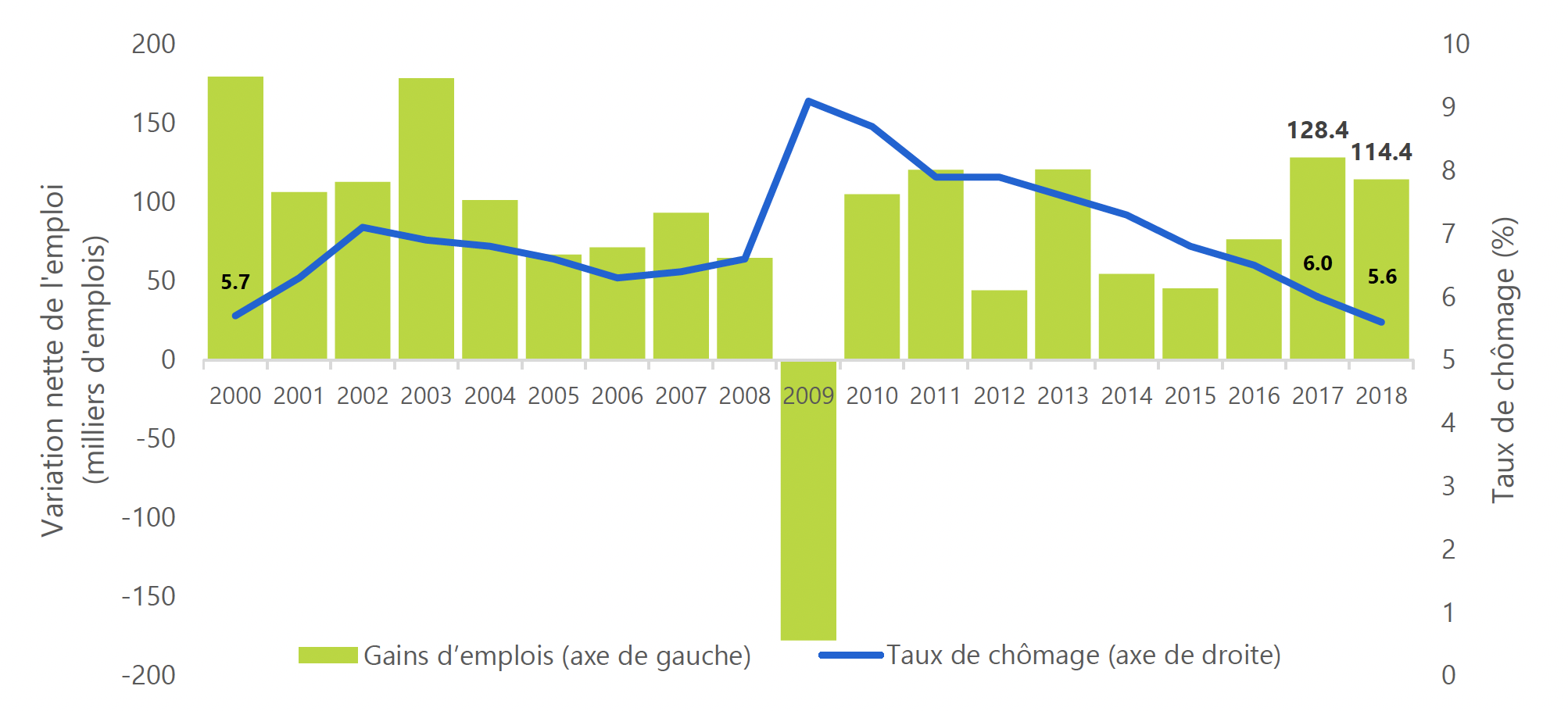 L’économie ontarienne a créé pas moins de 114 400 nouveaux emplois net en 2018[1], un résultat légèrement inférieur à celui de 2017, mais néanmoins bien supérieur à la moyenne des cinq dernières années. Cette forte hausse a contribué à réduire le taux de chômage, qui est passé à 5,6 % en 2018, le plus faible taux annuel depuis 1989.