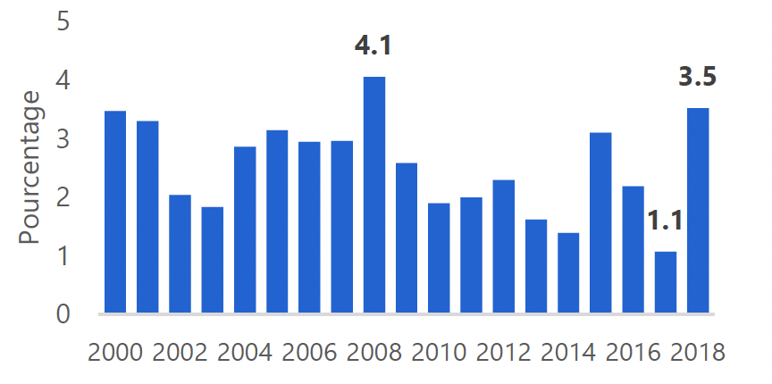 Ce graphique indique la croissance nominale du salaire horaire moyen de tous les travailleurs entre 2000 et 2018. Les salaires ont bondi de 3,5 %, alors que leur croissance était de 1,1 % en 2017. C’est leur plus forte hausse depuis 2008.Ce phénomène découle en grande partie du bond de 18,1 % qu’a fait salaire minimum ontarien le 1er janvier 2018 en passant de 11,85 $ à 14 $. Il s’explique également par la concomitance d’une forte demande de main-d’œuvre et d’un bassin restreint de travailleurs qualifiés.