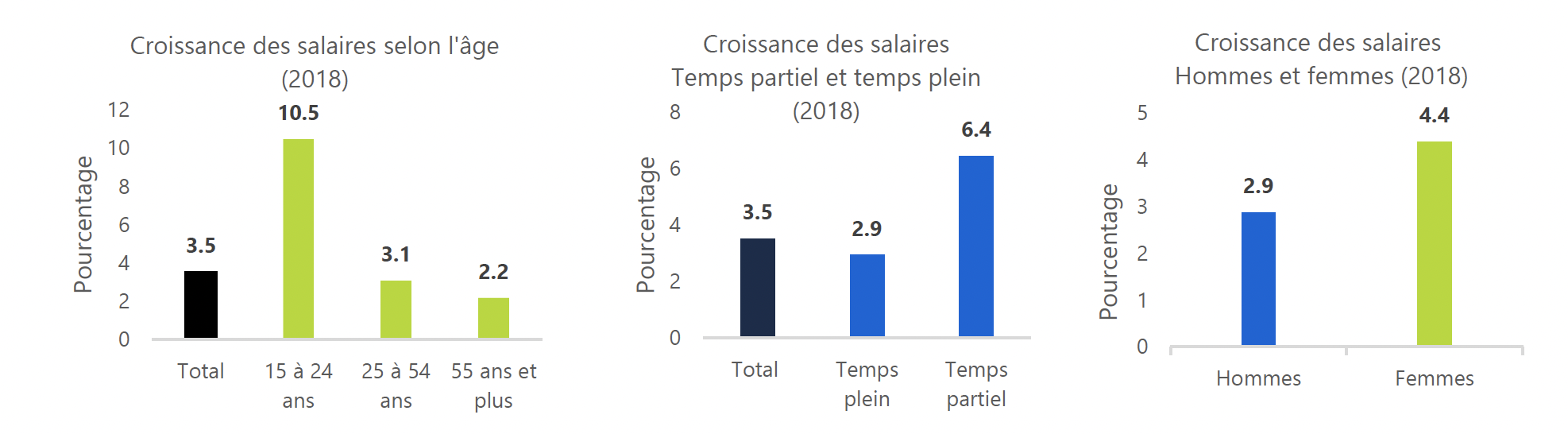 Les jeunes travailleurs (15 à 24 ans), souvent associés au salaire minimum, ont vu leur salaire augmenter de 10,5 % par rapport à l’an dernier. Les travailleurs d’âge moyen (25 à 54 ans) ont pour leur part vu leur salaire progresser de 3,1 %, et les travailleurs âgés (55 ans et plus), de 2,2 %.