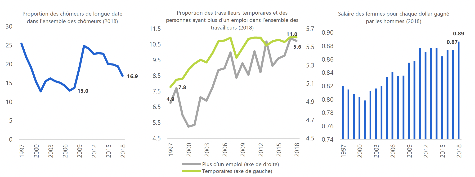 Ces trois graphiques groupés montrent la progression de quatre indicateurs du marché du travail entre 1997 et 2018 : proportion des chômeurs de longue date dans l’ensemble des chômeurs; proportion des travailleurs temporaires dans l’ensemble des travailleurs; proportion des personnes ayant plus d’un emploi dans l’ensemble des travailleurs; salaire des femmes pour chaque dollar gagné par les hommes. En 2018, la part des chômeurs de longue date dans l’ensemble des chômeurs a diminué, passant à 16,9 %, mais elle est restée au-dessus de son niveau d’avant la récession, qui était de 13 %. Les travailleurs temporaires et les personnes ayant plus d’un emploi représentent la même proportion des travailleurs qu’en 2017 : 11,0 % et 5,6 %, respectivement. L’écart des salaires entre les sexes s’est amenuisé en 2018 : pour chaque dollar gagné par les hommes, le salaire des femmes est passé de 87 à 89 cents depuis 2017.La participation au marché du travail continue de baisser