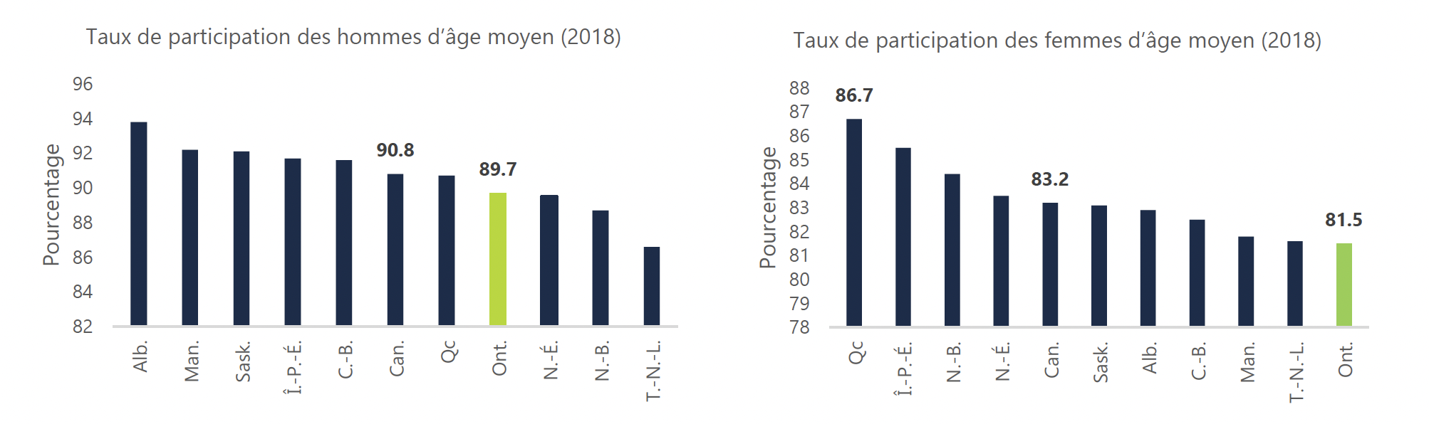 Ce graphique contient une série de tableaux illustrant les taux de participation des hommes et des femmes du groupe d’âge principal pour l’Ontario comparativement aux autres provinces en 2018. Chez les hommes, le taux de participation était de 89,7 %, soit moins que la moyenne canadienne de 90,8 %; seules trois provinces affichaient un taux plus faible. Chez les femmes, le taux de participation s’établissait à 81,5 %, donc moins que la moyenne nationale de 83,2 % et beaucoup moins que le taux de 86,7 % observé au Québec pour ce groupe.La faiblesse relative du taux de participation au marché du travail est encore plus marquée chez les femmes adultes. En effet, en 2018, 81,5 % des femmes ontariennes d’âge moyen participaient au marché du travail; l’Ontario se classe ici au dernier rang des provinces. Au Québec, ce taux s’élevait à 86,7 % en 2018, plus de cinq points de pourcentage de plus qu’en Ontario.
