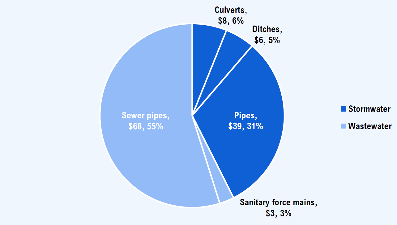 The FAO estimates that the current replacement value[12] (CRV) of these storm and wastewater assets is $124 billion in 2022. Figure 3-1 presents the breakdown of this valuation by asset type. Stormwater assets account for 43 per cent of the CRV, while wastewater assets account for 57 per cent.