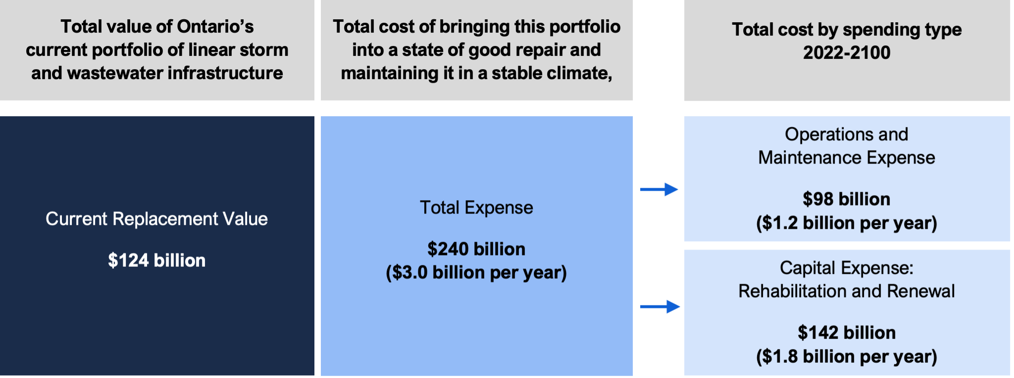 The FAO projects that bringing Ontario’s existing suite of linear storm and wastewater infrastructure into a state of good repair and maintaining it until 2100 would have cost an average of $3.0 billion per year in a stable climate, which would accumulate to approximately $240 billion by the end of the century. This cumulative baseline cost includes $98 billion ($1.2 billion per year) in O&M expense and $142 billion ($1.8 billion per year) in rehabilitation and renewal expense to 2100.