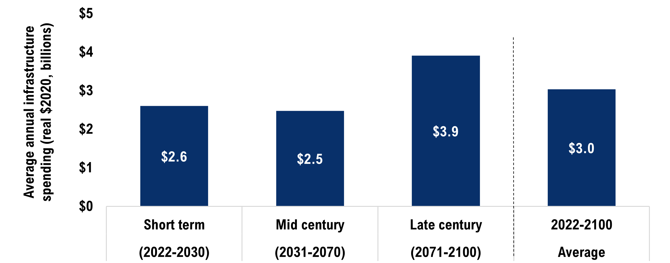 - The short term (2022-2030) shows how changing climate hazards are already impacting public infrastructure costs in the current decade.