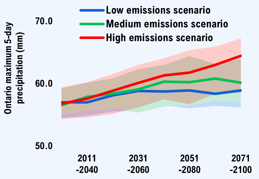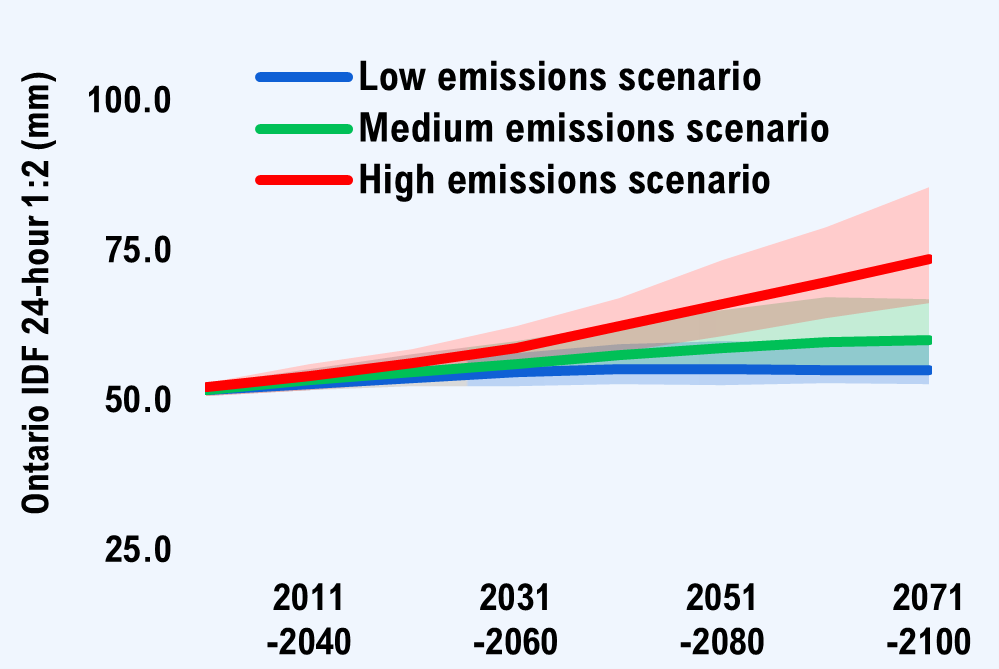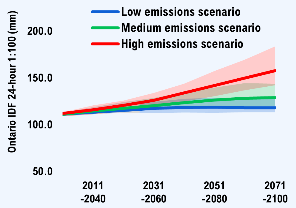 The impacts of extreme rainfall on Ontario’s public storm and wastewater infrastructure will depend on the path of global greenhouse gas emissions and the extent of global mean temperature increases. The FAO costed climate impacts to public storm and wastewater infrastructure for three global emissions scenarios: