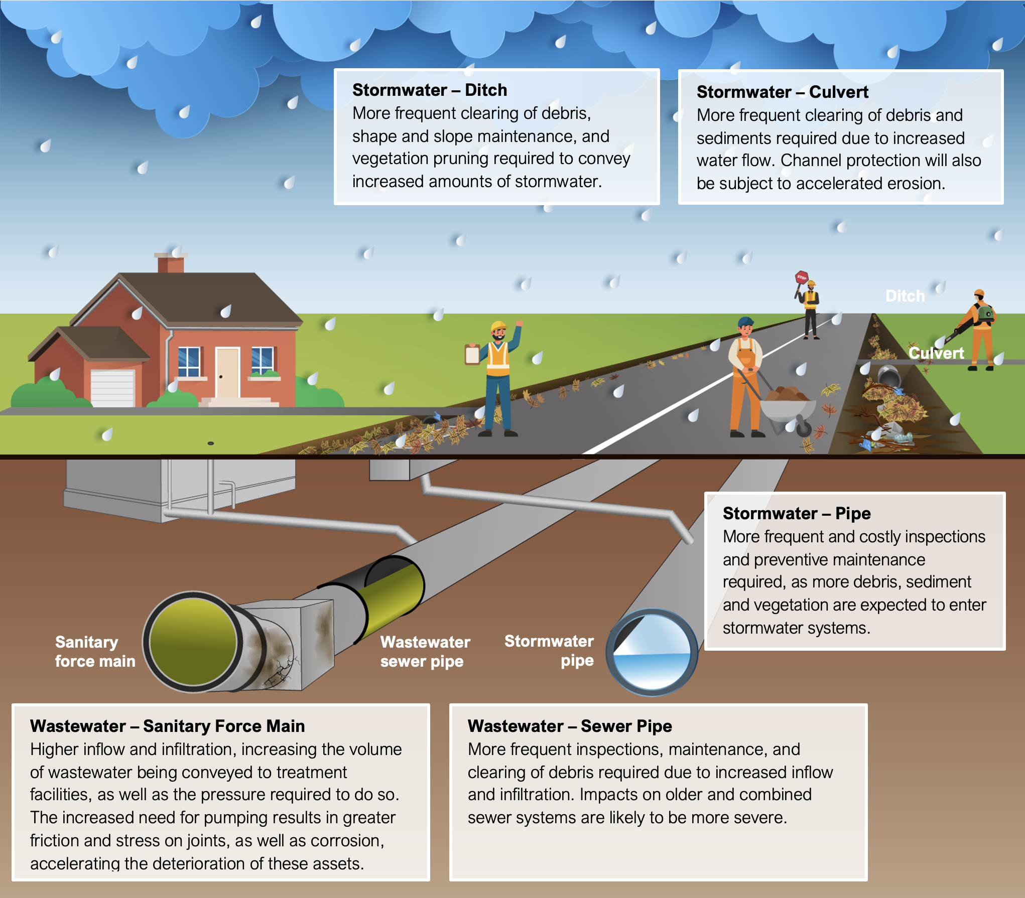 Unlike with buildings and transportation infrastructure, extreme heat or freeze-thaw cycles are not expected to significantly impact storm and wastewater infrastructure since many components are buried underground. However, extreme rainfall will have significant impact on storm and wastewater infrastructure as the frequency and intensity of storm events increase over the century.[25]