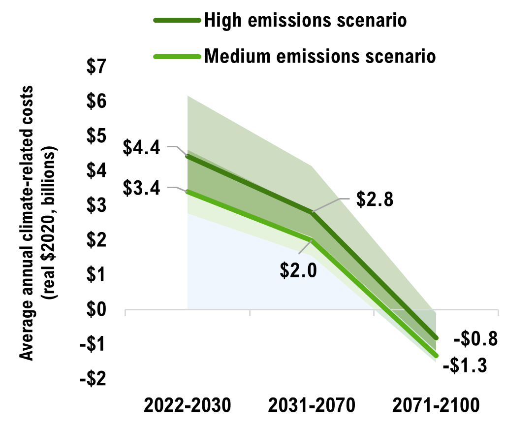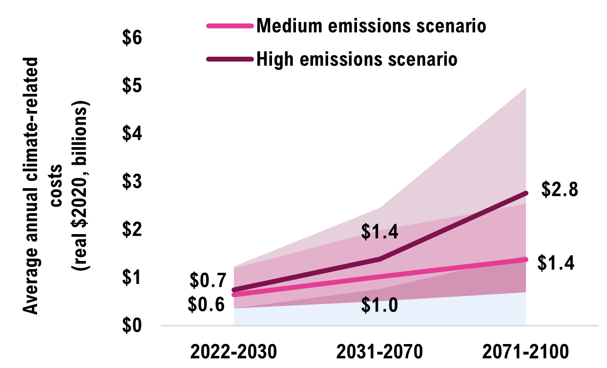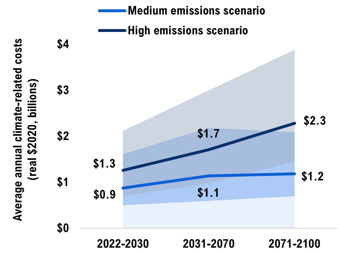 [32] The $6.2 billion in cumulative climate-related costs by 2030 is the average of the medium and high emissions scenarios’ median projections. This cost could range from $3 billion to $11 billion given the climate and engineering uncertainties.