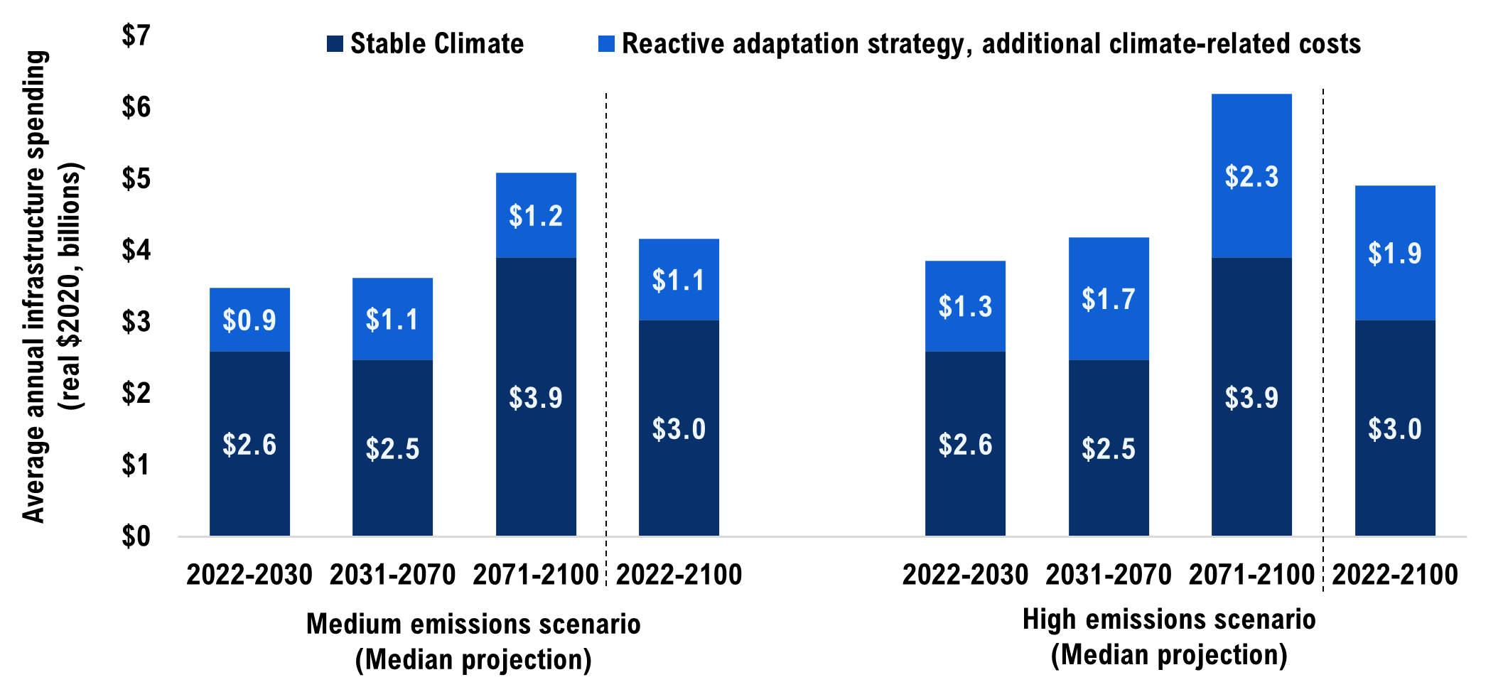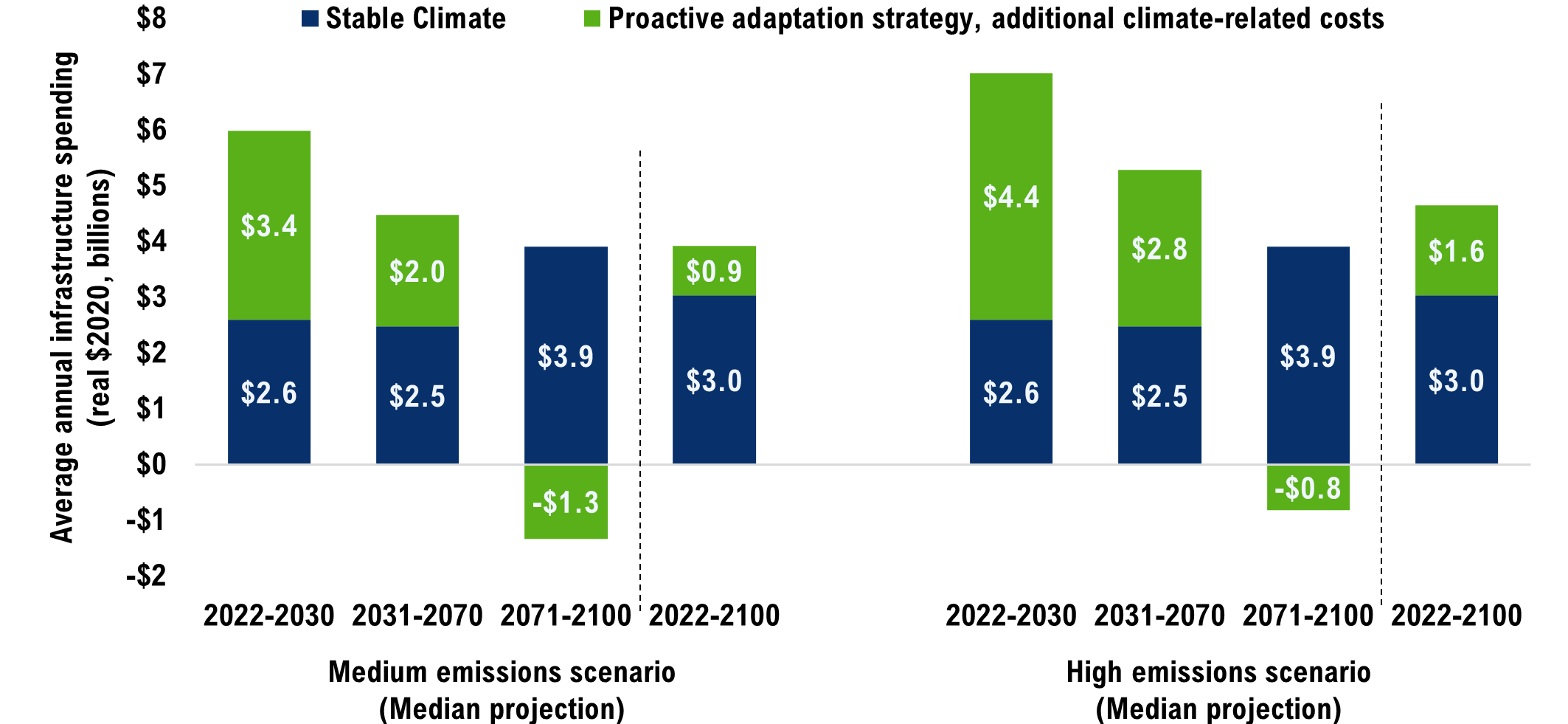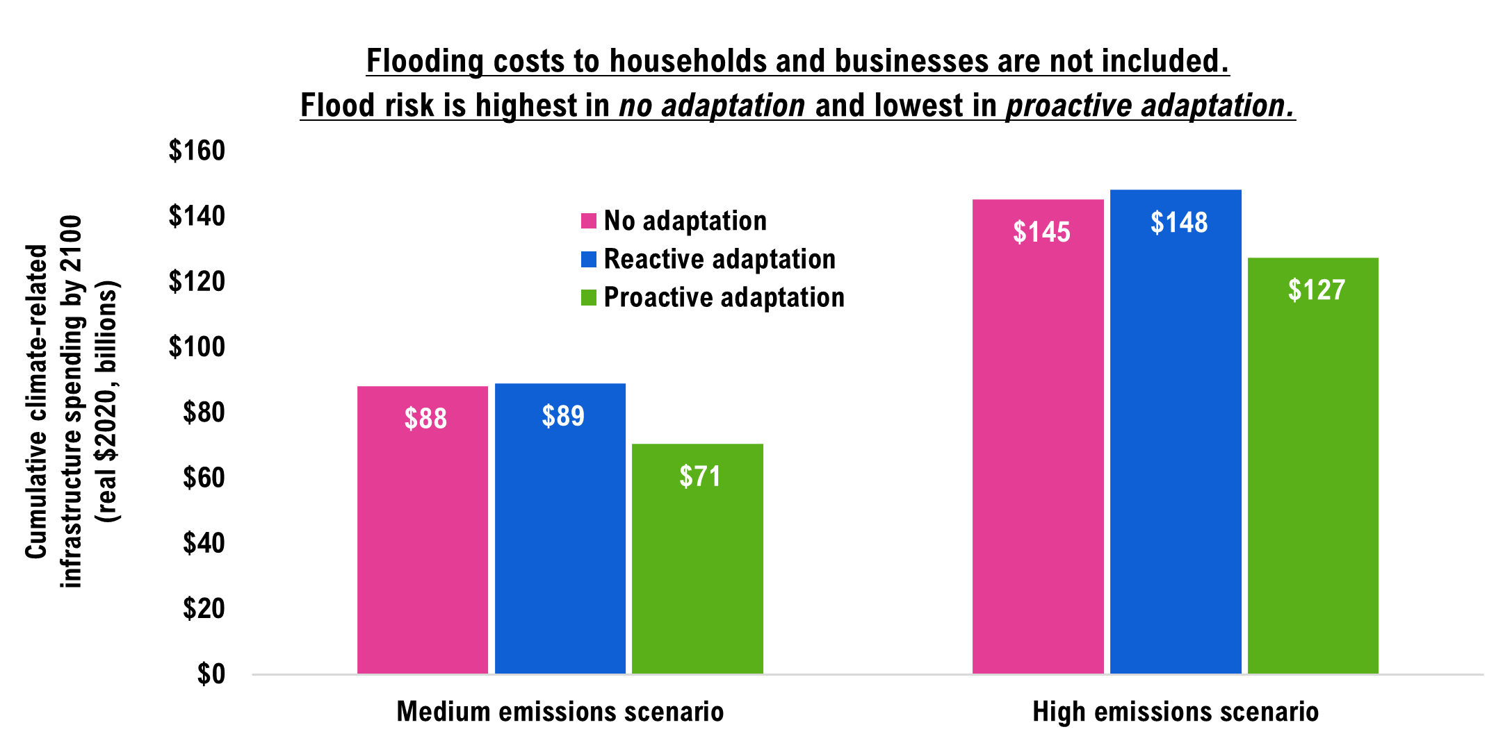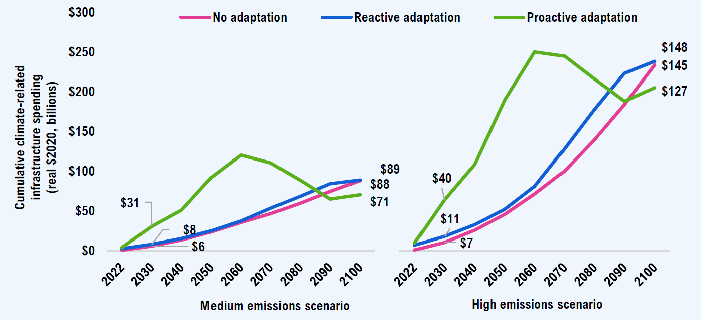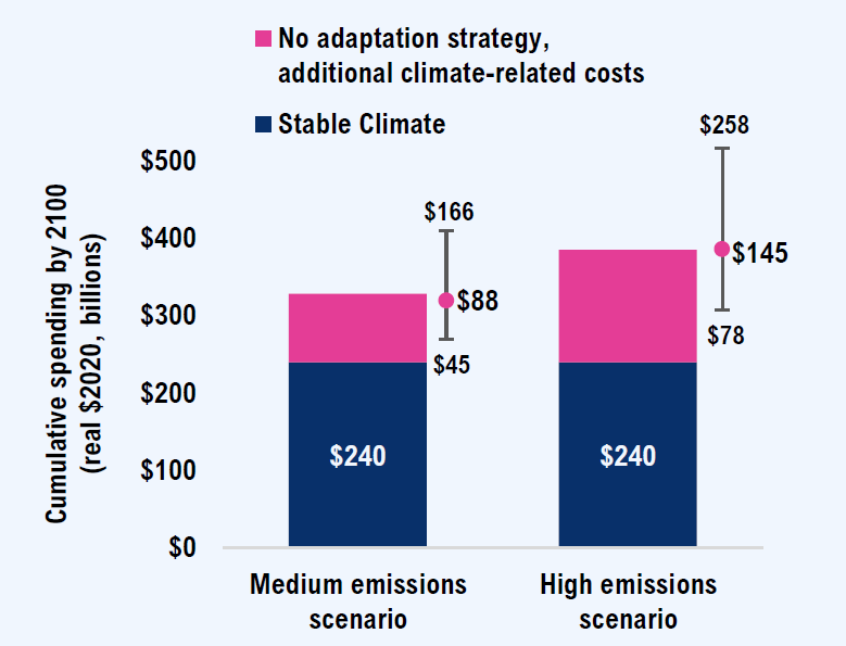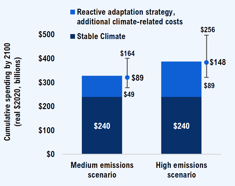 [52] These costs could range from $25 billion to $41 billion in the medium emissions scenario and from $31 billion to $56 billion in the high emissions scenario given the climate and engineering uncertainties.