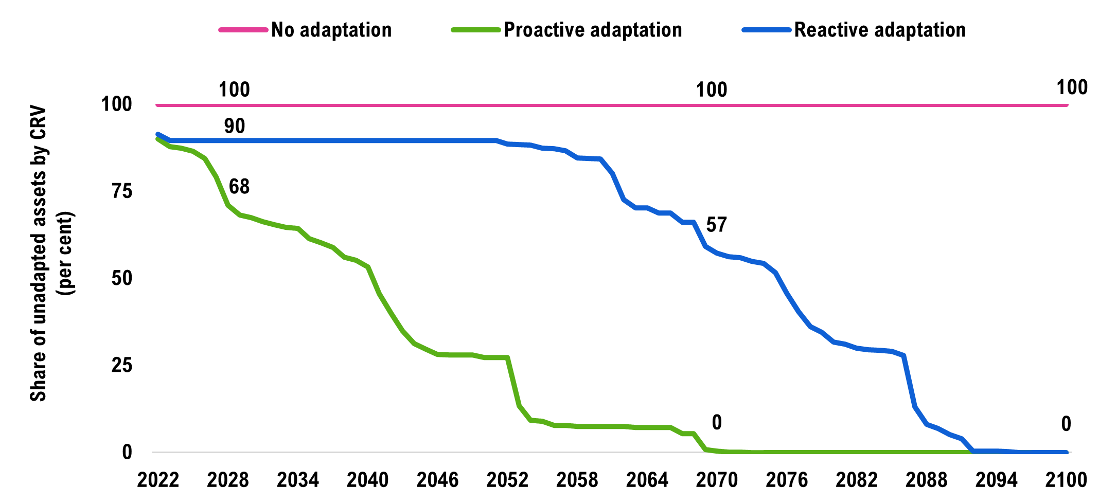 [49] The 2080s are selected to approximate the changes in climate in the latter half of the 21st century. The decadal adaptation costs are presented in Appendix C. However, in practice, assets can be adapted to the projected climate over the service life of individual assets.