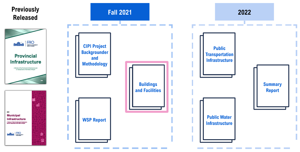 The FAO estimates that Ontario’s provincial and municipal governments currently own and manage about $254 billion[3] of public buildings and facilities. These assets include hospitals, schools, colleges, administration buildings, correctional facilities, courthouses, transit facilities, social housing, tourism, culture and sport facilities, as well as potable, storm water and wastewater facilities.