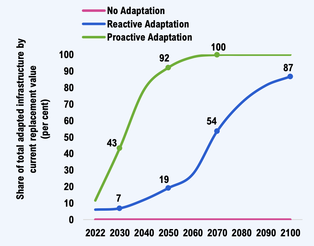 [30] This report measures the susceptibility of assets to changing climate hazards by the no adaptation strategy’s percentage increase in infrastructure costs above the stable climate base case.
