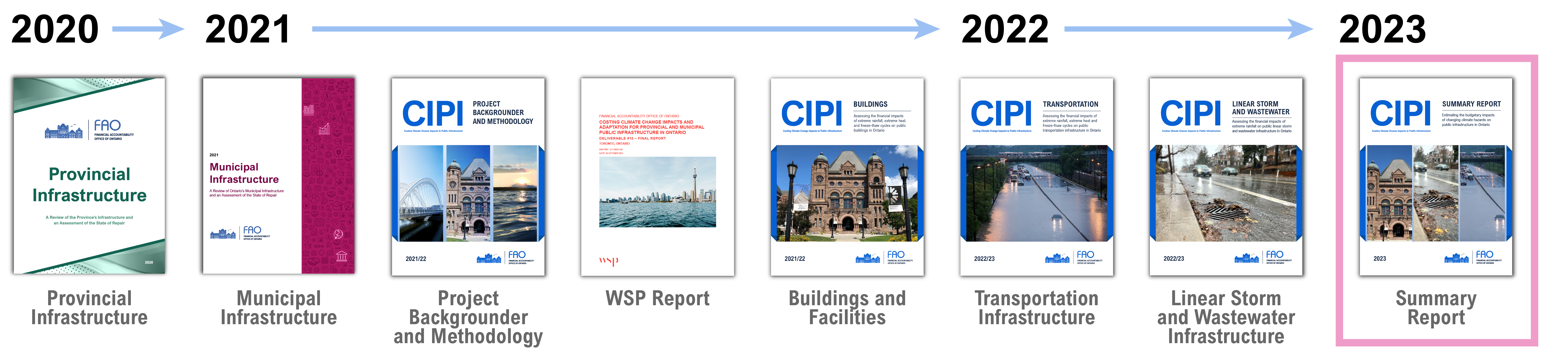 The project began with two reports assessing the composition and state of repair of provincial and municipal infrastructure. Then, in the fall of 2021, the FAO released three reports: the CIPI project backgrounder, which described the overall context and methodology of the CIPI project; a report prepared by WSP Global, which detailed the engineering impacts of these climate hazards on public infrastructure; and the first CIPI sector report, which described how changes in these climate hazards will impact the long-term costs of maintaining Ontario’s public buildings and facilities in a state of good repair. This was followed by sector reports for transportation infrastructure and linear storm and wastewater infrastructure.