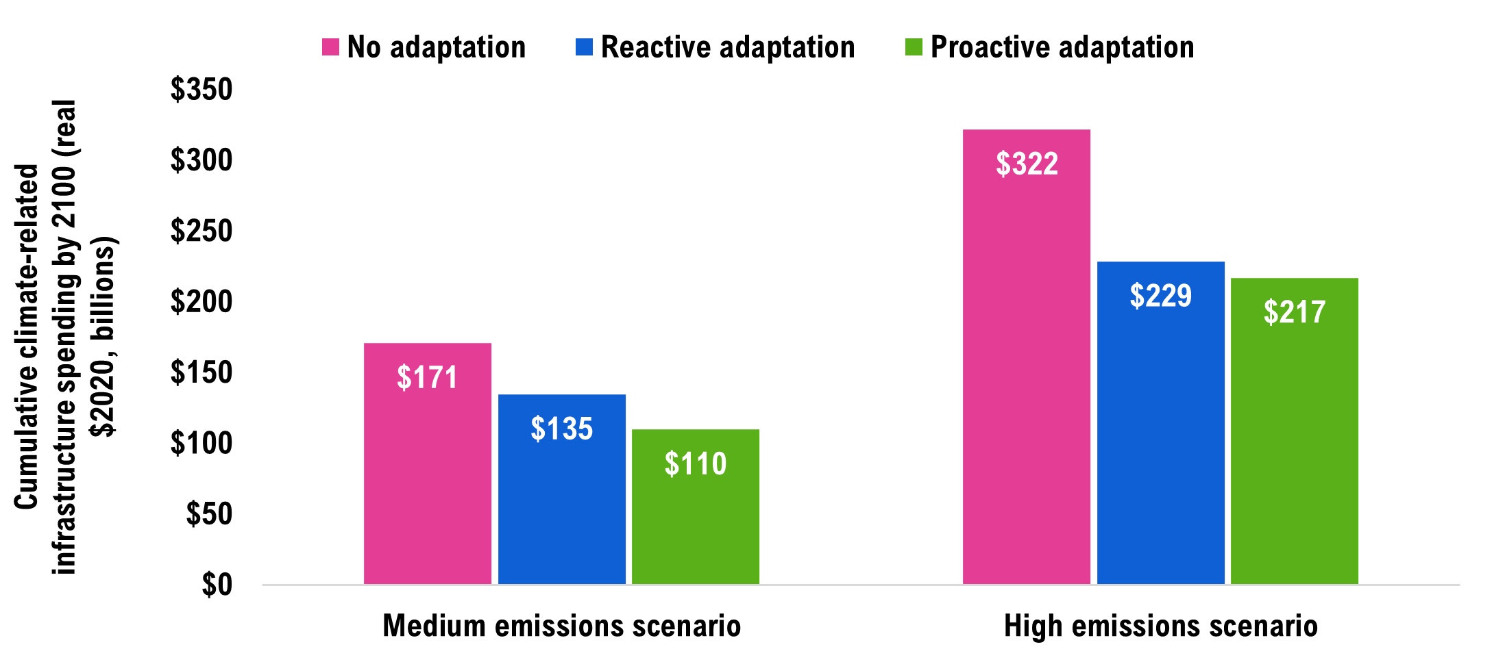 [46] These costs could range from $11 billion to $46 billion in the medium emissions scenario and from $24 billion to $81 billion in the high emissions scenario given the climate and engineering uncertainties.
