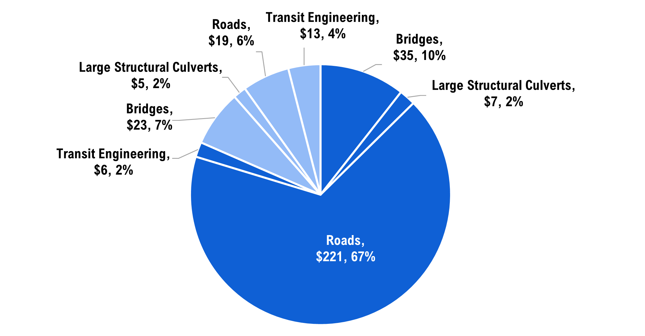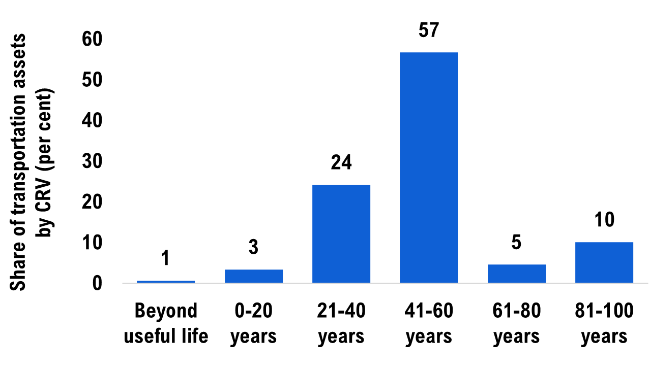 This report focuses on transportation infrastructure owned and controlled by provincial and municipal governments. The FAO estimates that the current replacement value[6] (CRV) of these assets is at least $330 billion in 2022.[7] The public transportation assets included in the scope of this report are roads, bridges, large structural culverts as well as transit engineering assets:[8]
