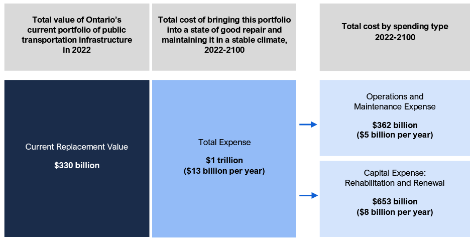 The current replacement value (CRV) of Ontario’s current portfolio of public transportation infrastructure in 2022 is $330 billion. In a stable climate, the cumulative cost of bringing and maintaining Ontario’s existing suite of public transportation infrastructure into a state of good repair until 2100 would be $1 trillion, or an average of $12.9 billion per year. This baseline cost includes $362 billion ($4.6 billion per year) in cumulative operations and maintenance (O&M) expense and $653 billion ($8.3 billion per year) in rehabilitation and renewal expense to 2100.