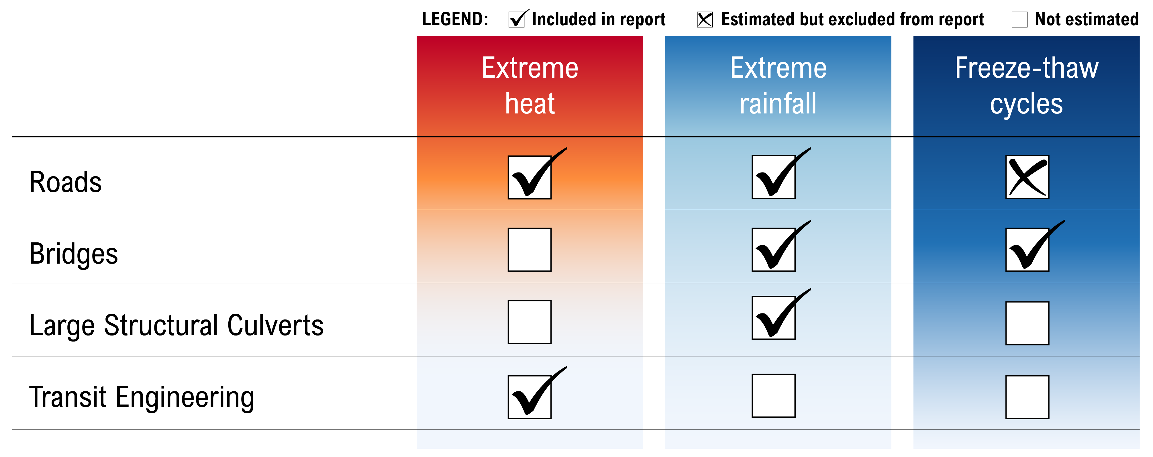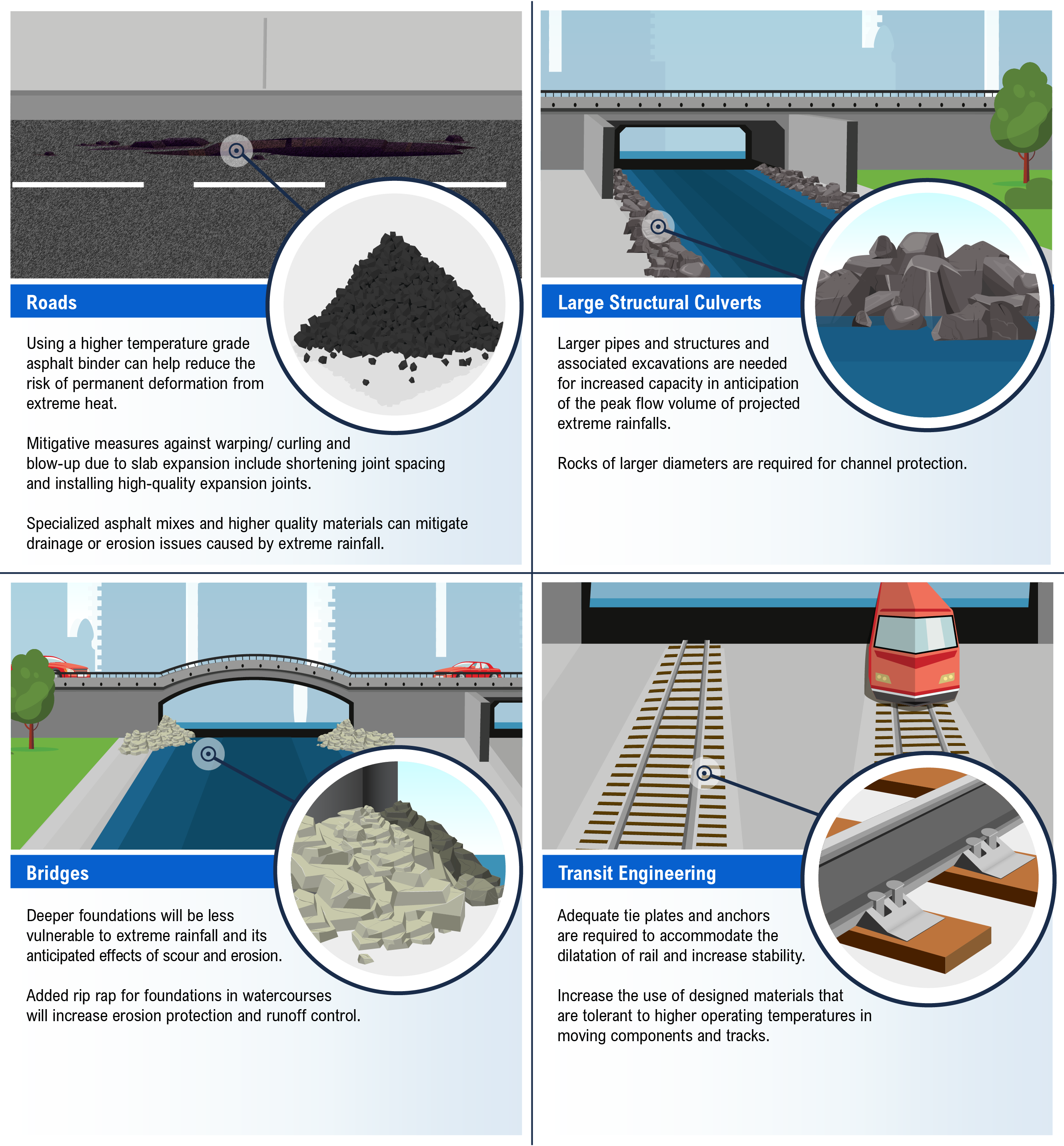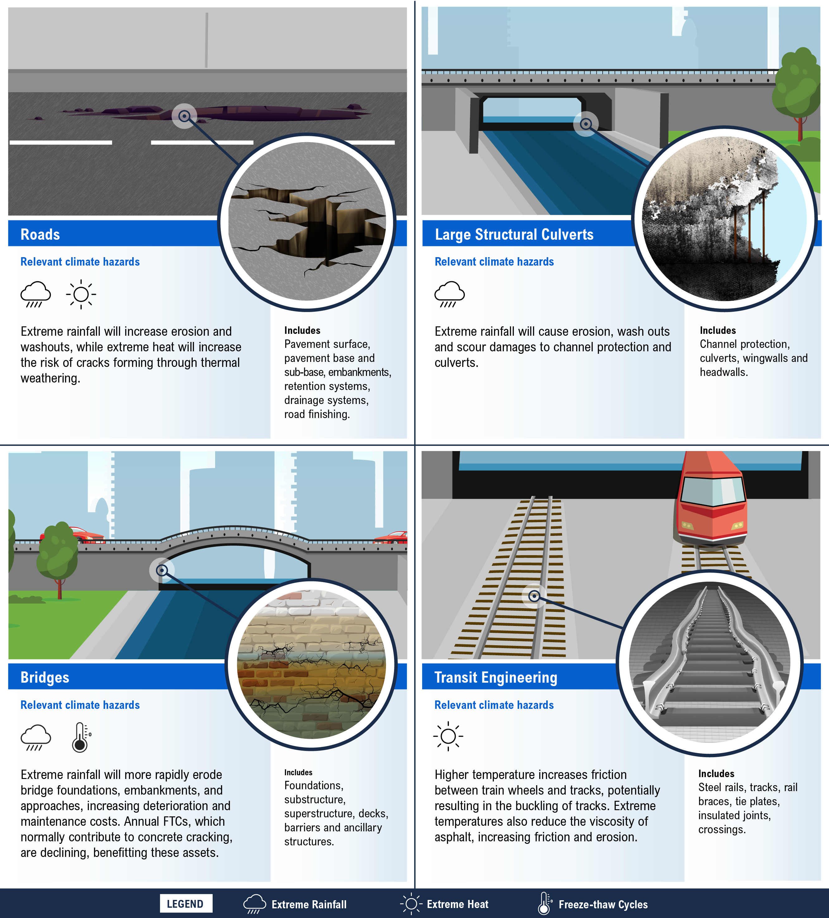 Changing climate hazards will impact transportation infrastructure assets in different ways. Of all the possible hazard–asset type interactions, this report examines six impacts: extreme rainfall and extreme heat on roads, extreme rainfall and freeze-thaw cycles on bridges, extreme rainfall on large structural culverts, and extreme heat on transit engineering (Figure 4-1). The following section provides an overview of how these climate hazards will impact the different asset types.[22]