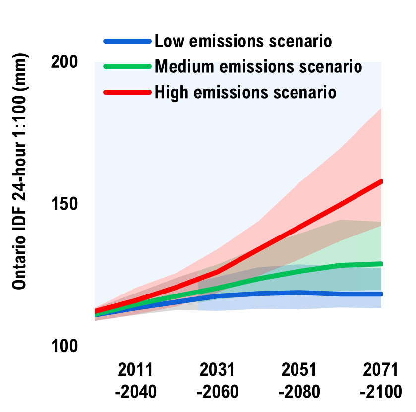 Climate change is associated with many hazards to public infrastructure, which can take the form of extreme weather events or long-term chronic impacts. Ontario has been subject to costly floods and ice storms and is also prone to droughts, intense rainfall, wildfires, windstorms, heatwaves, and permafrost melt.[18] This project focuses on only three climate hazards – extreme rainfall, extreme heat and freeze-thaw cycles – as they were determined to have broad and financially material impacts to public infrastructure and can be projected with a reasonable degree of scientific confidence.[19]