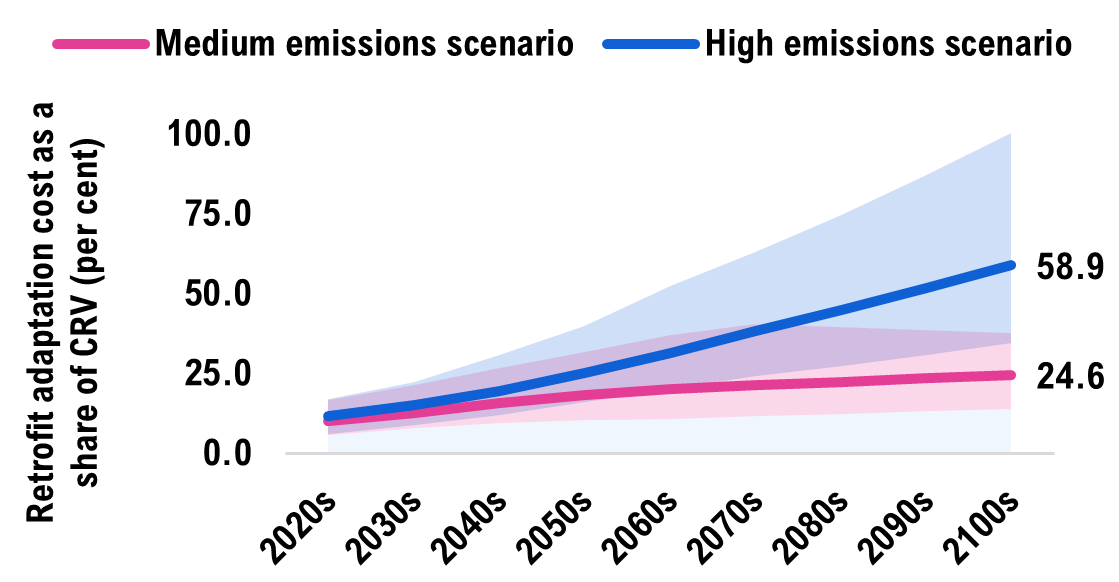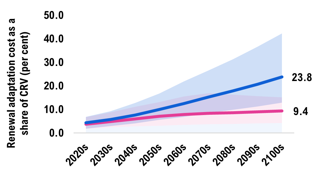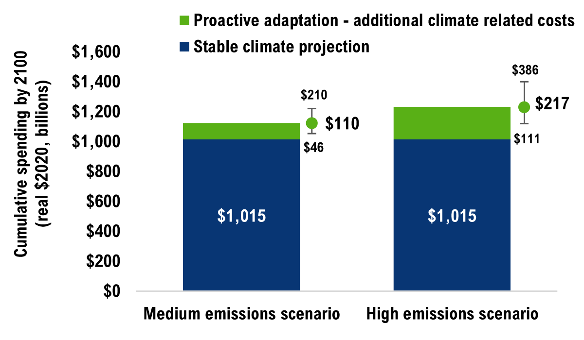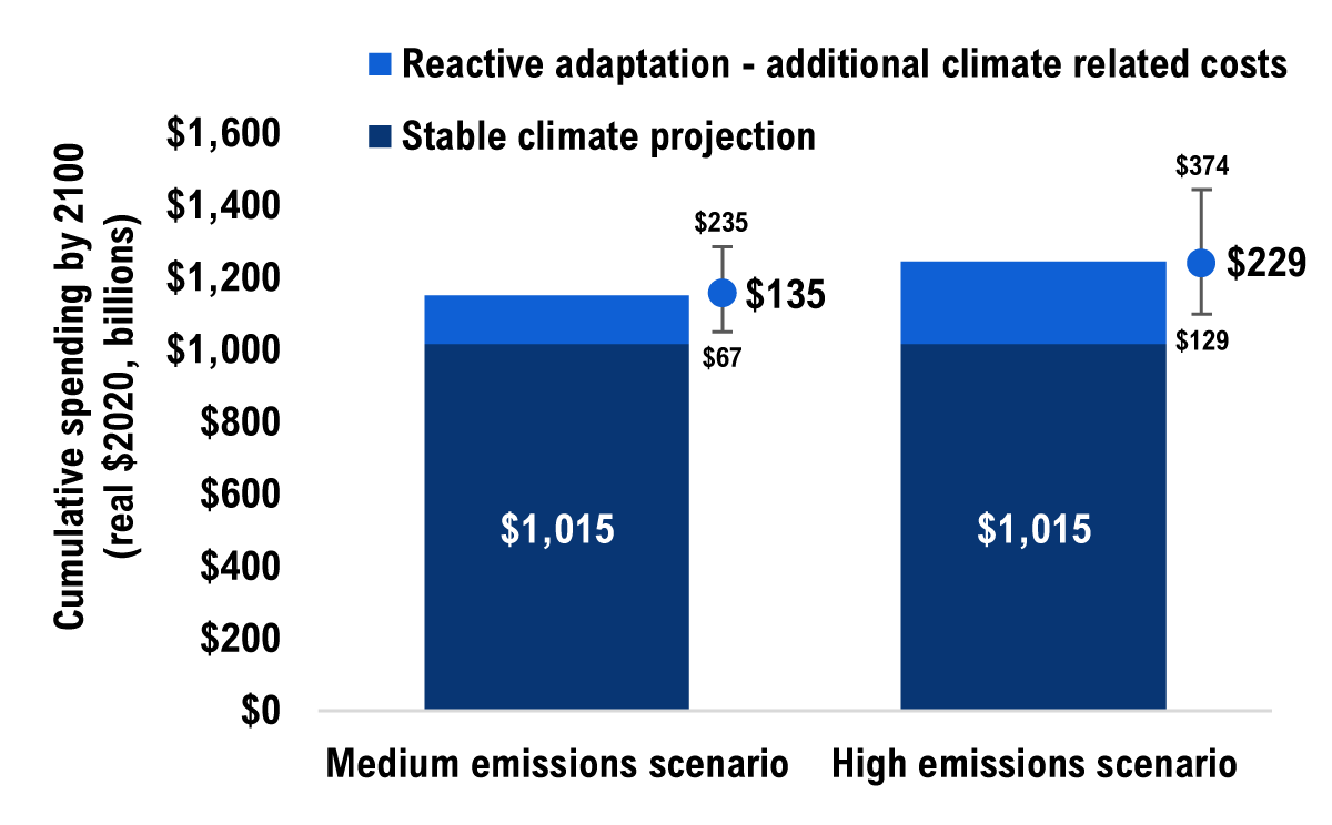 [45] These costs could range from $8 billion to $23 billion in the medium emissions scenario and from $10 billion to $29 billion in the high emissions scenario given the climate and engineering uncertainties.