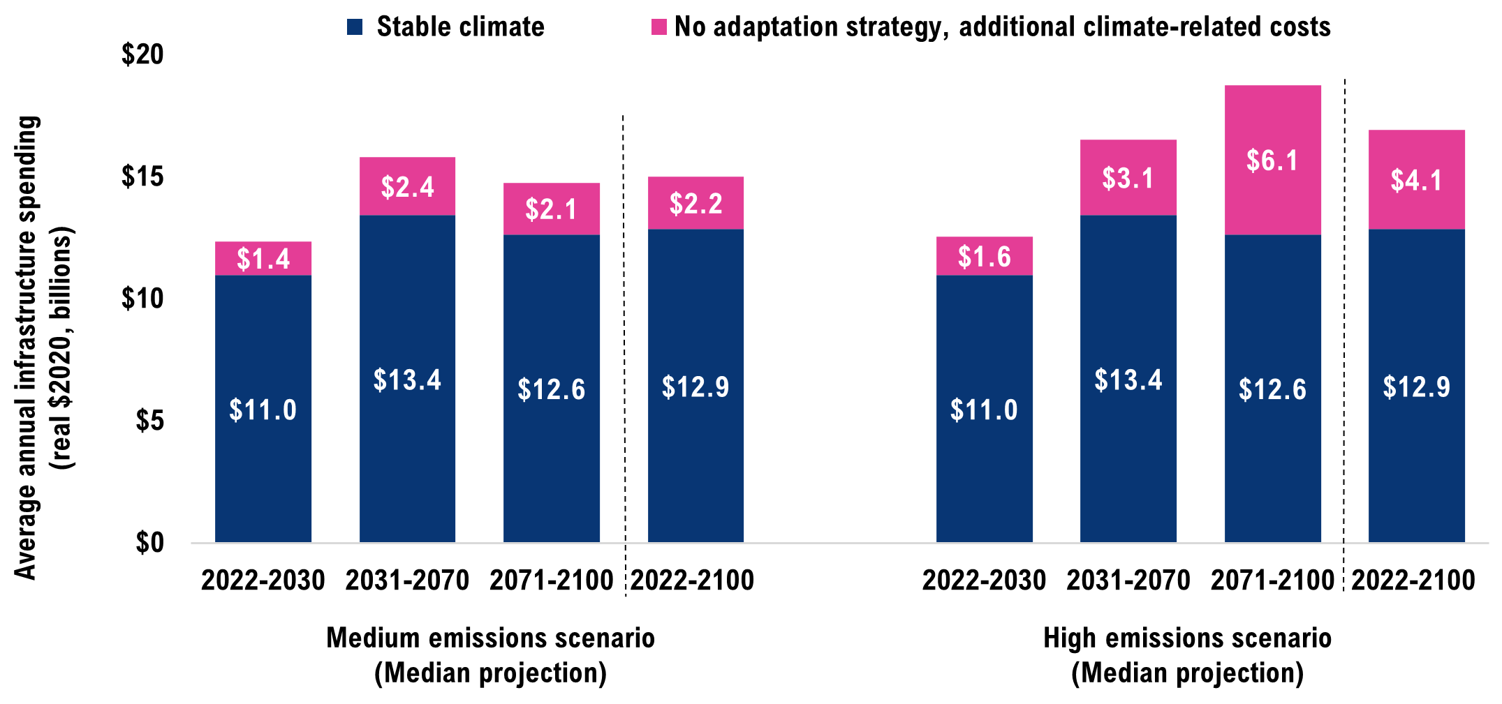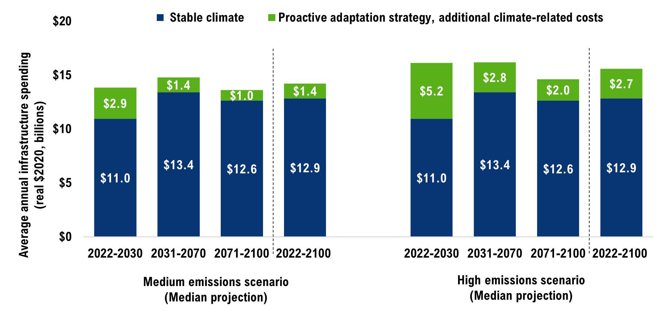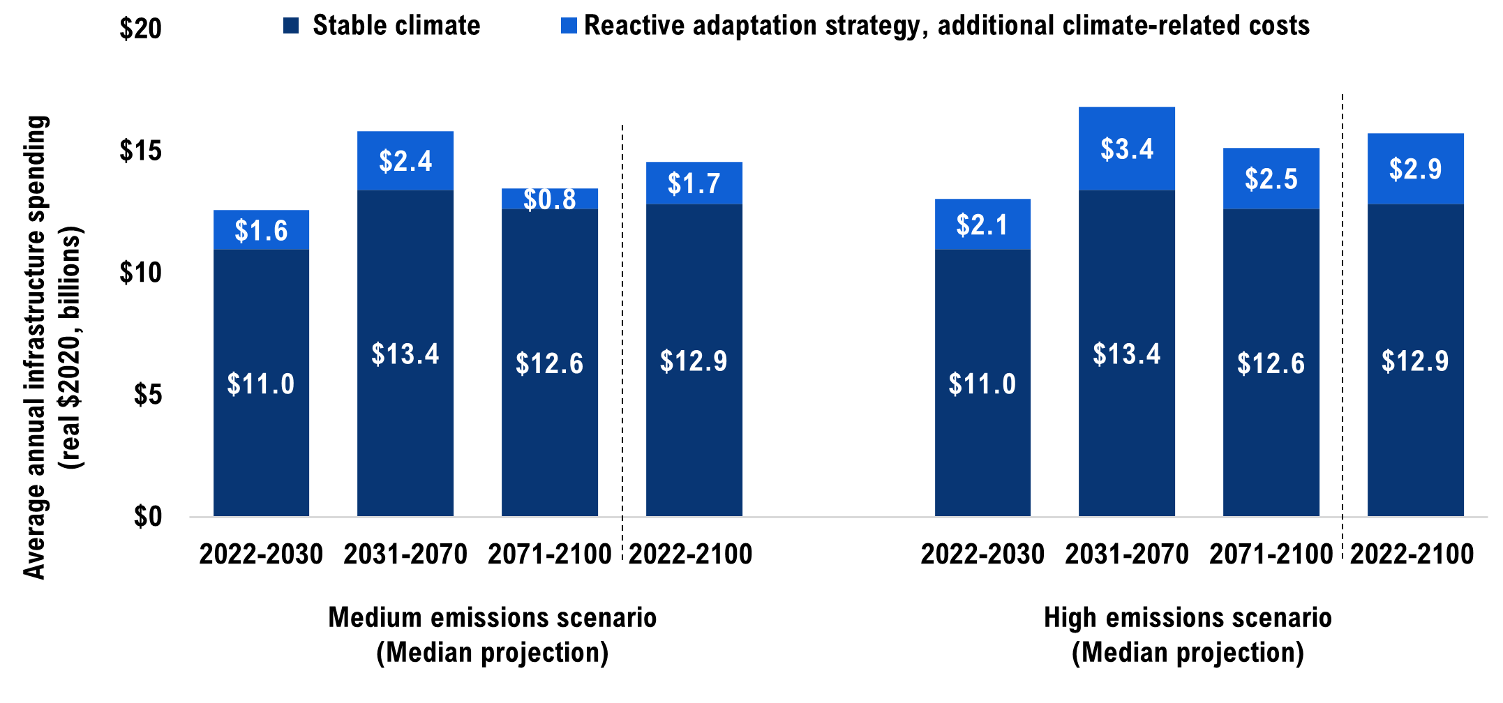 [45] These costs could range from $8 billion to $23 billion in the medium emissions scenario and from $10 billion to $29 billion in the high emissions scenario given the climate and engineering uncertainties.