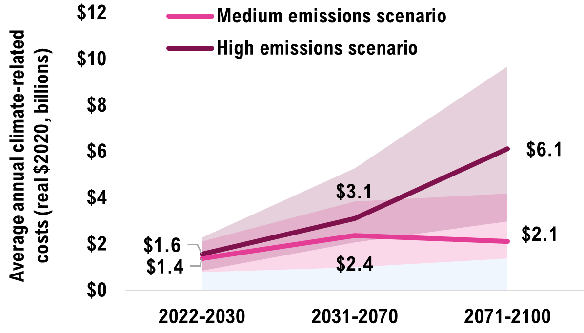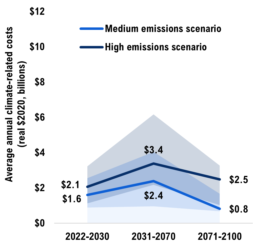 [30] The $13.3 billion in cumulative climate-related costs by 2030 is the average of the medium and high emissions scenarios’ median projections. This cost could range from $7 billion to $20 billion given the climate and engineering uncertainties.