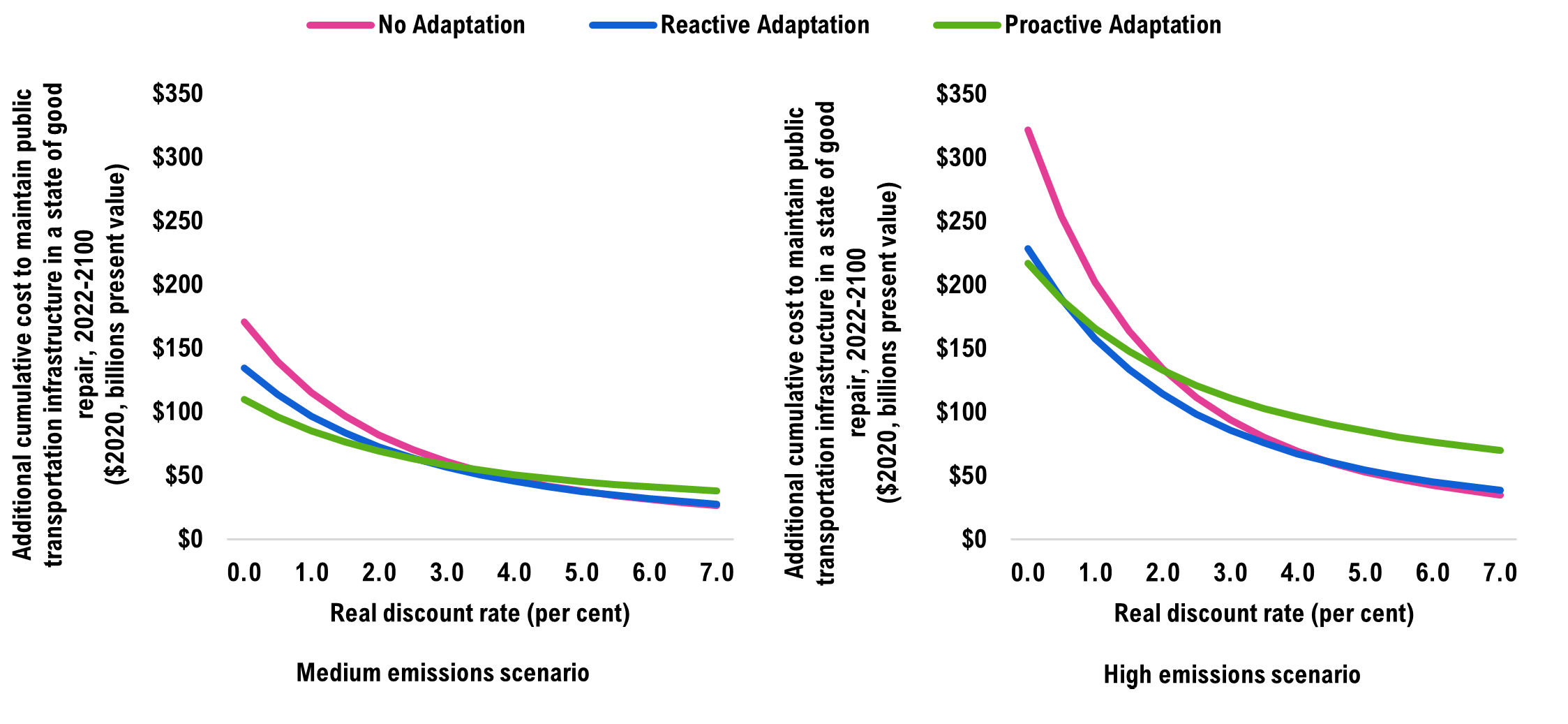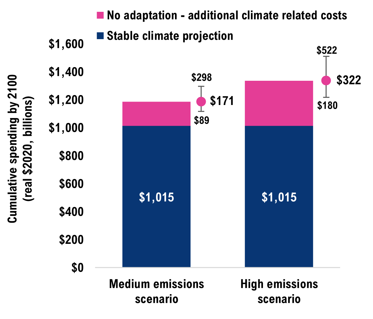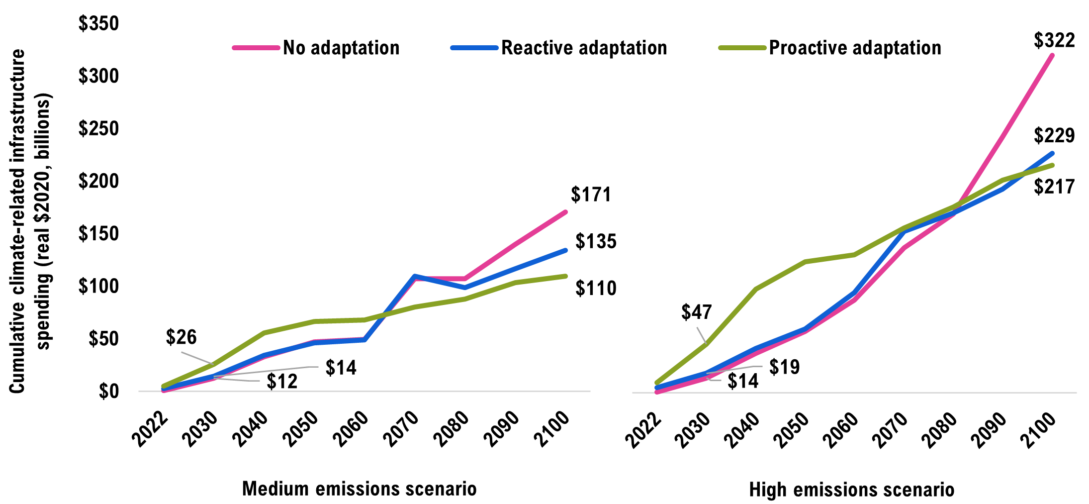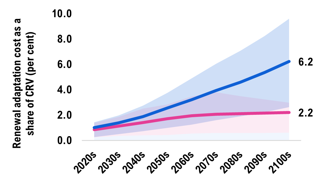 Note: The costs in this chart are based on the median (or 50th percentile) projection under each emissions scenario and are in addition to the baseline costs over the same period. For presentation purposes, the uncertainty bands are not shown in this figure.