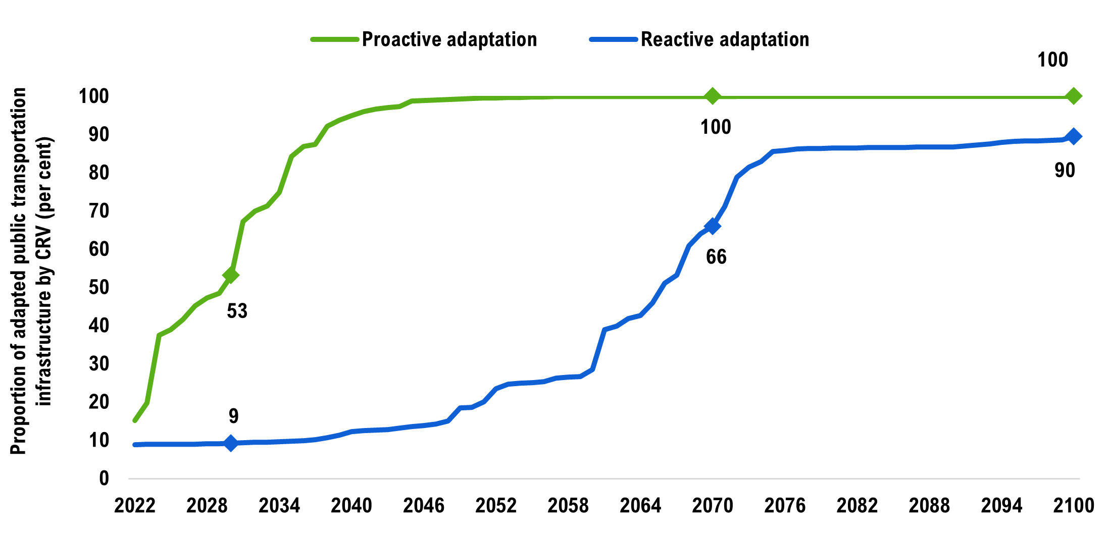 Depending on the emissions scenario, adapting public transportation infrastructure will add between $110 billion to $229 billion to infrastructure costs relative to a stable climate scenario by 2100. This represents a cost increase between 11 and 23 per cent. While significant, these additional climate-related costs are lower than those incurred in the absence of adaptation.