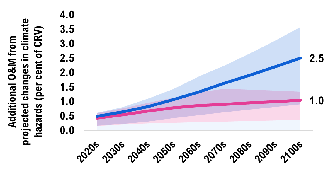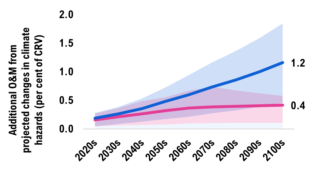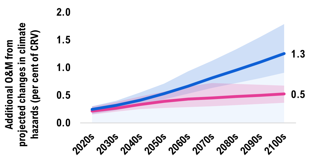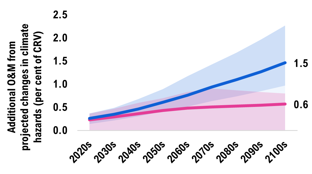 [42] Assets are only adapted to climate hazards that are projected to drive damage costs in the absence of adaptation. For example, a reduction in freeze-thaw cycles will extend the useful service life and reduce the O&M expense of certain assets. However, it is assumed to be unlikely that design standards will ease in response. For details, see Page viii WSP, 2021.