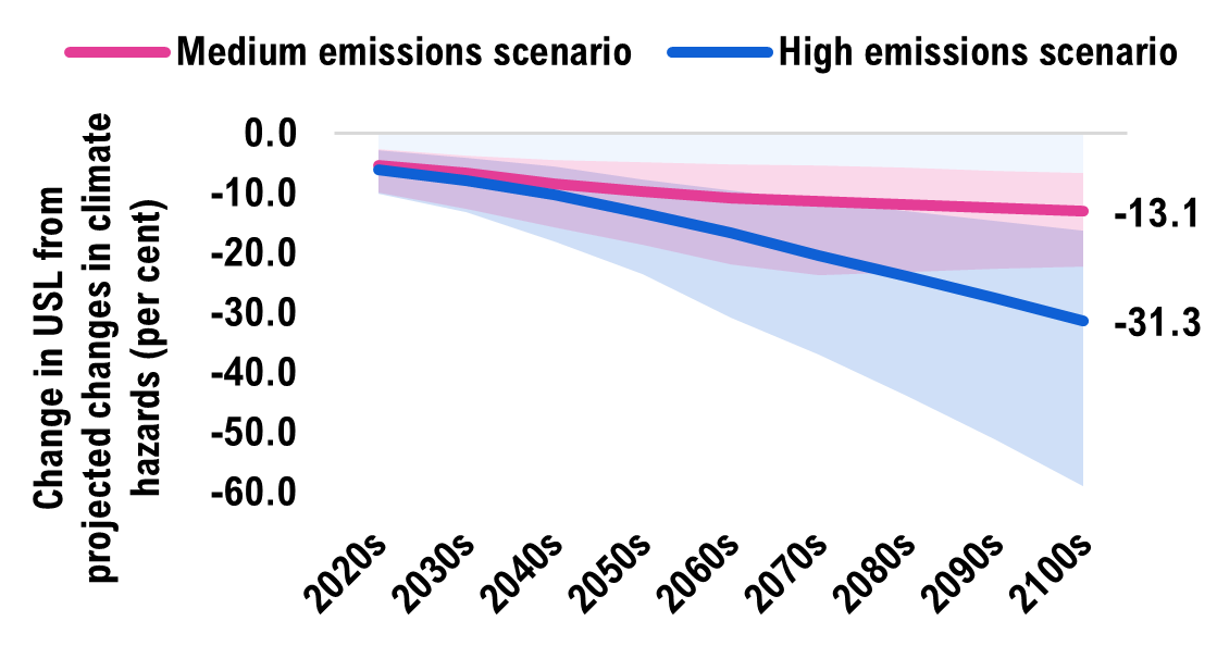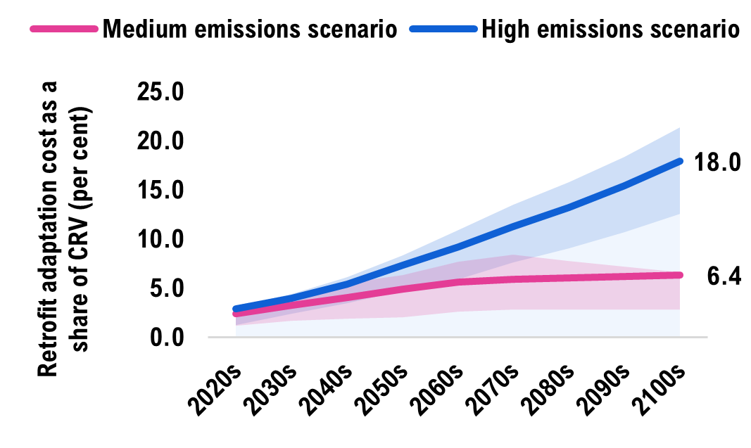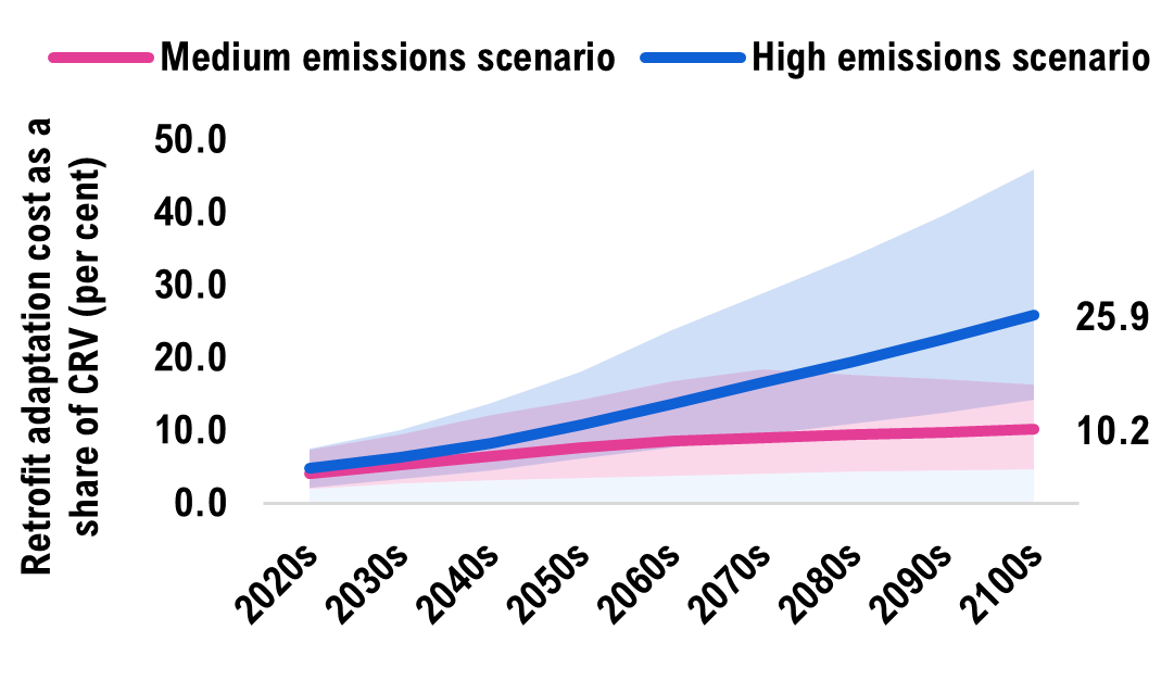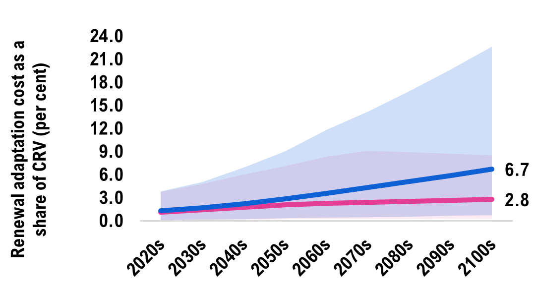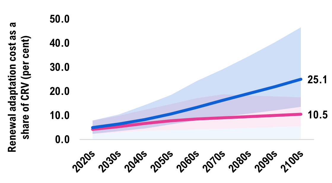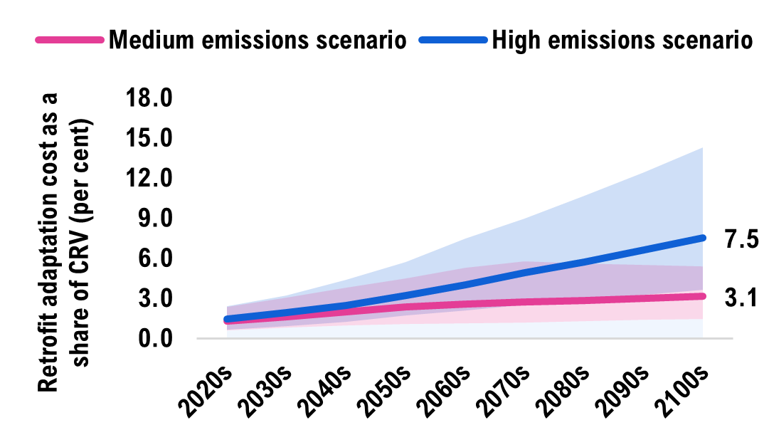 [41] The 2080s are selected to approximate the changes in climate in the latter half of the 21st century. The decadal adaptation costs are presented in Appendix C. However, in practice, assets can be adapted to the projected climate over the service life of individual assets. In the FAO’s modelling framework, the cumulative portfolio-wide adaption costs do not materially change when assets are adapted to withstand climate projections over their remaining service life.