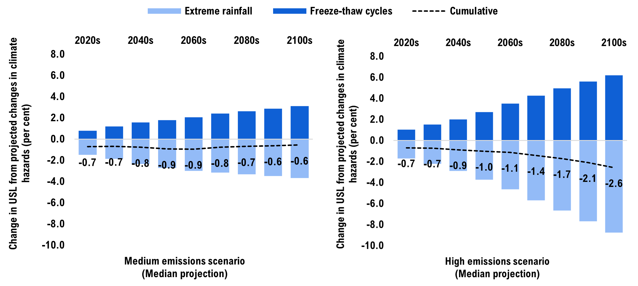 To ensure safety and reliability, infrastructure is designed, built and maintained to withstand a specific range of climate conditions typically based on historic climatic loads.[20] However, extreme rainfall and extreme heat are projected to increase in the future, while freeze-thaw cycles are projected to decrease.[21]