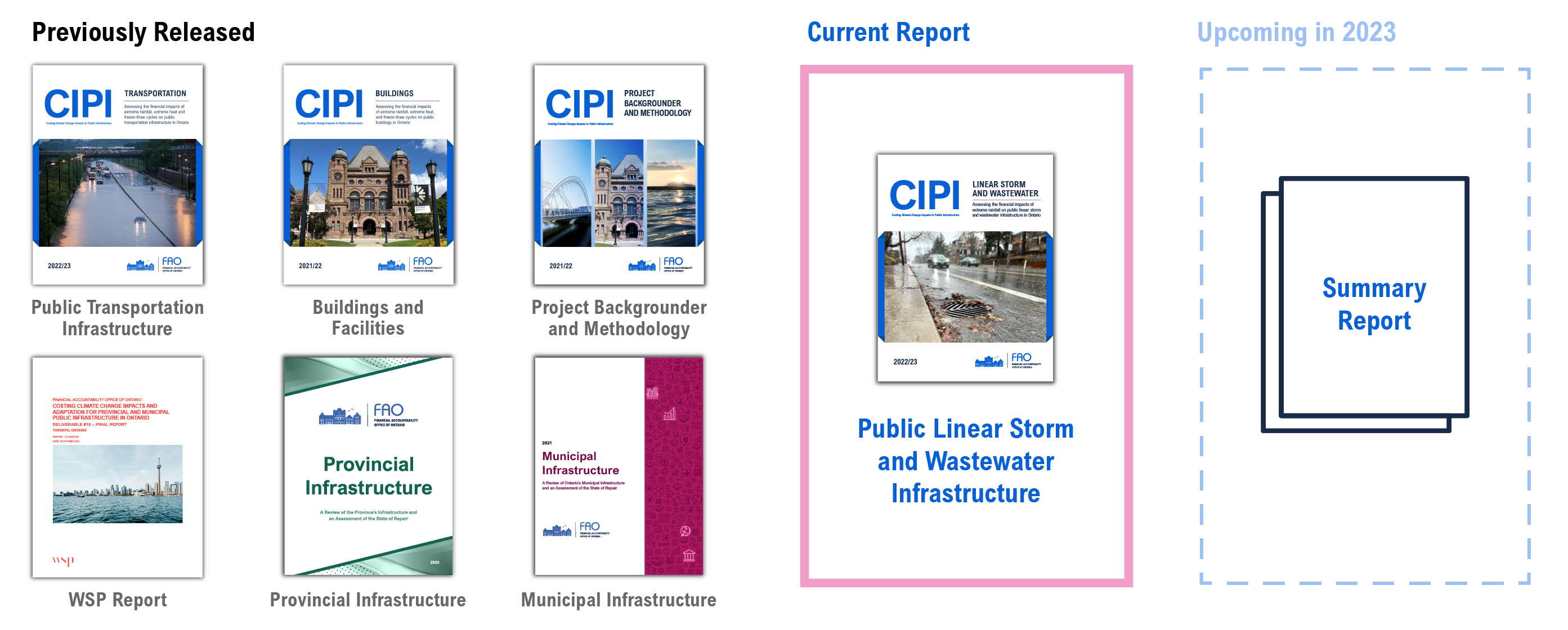 In fall 2021, as part of the second phase of the project, the FAO released three reports: a project backgrounder[3] describing the overall context and methodology of the project, a report prepared by WSP Global describing the detailed engineering impact of climate hazards on public infrastructure,[4] and a report detailing how changes in extreme rainfall, extreme heat and freeze-thaw cycles will impact the long-term costs of maintaining Ontario’s public buildings and facilities in a state of good repair.[5] In September 2022, as part of the final phase, the FAO released a report detailing how changes in extreme rainfall, extreme heat and freeze-thaw cycles will impact the long-term costs of maintaining Ontario’s public transportation infrastructure in a state of good repair.[6]