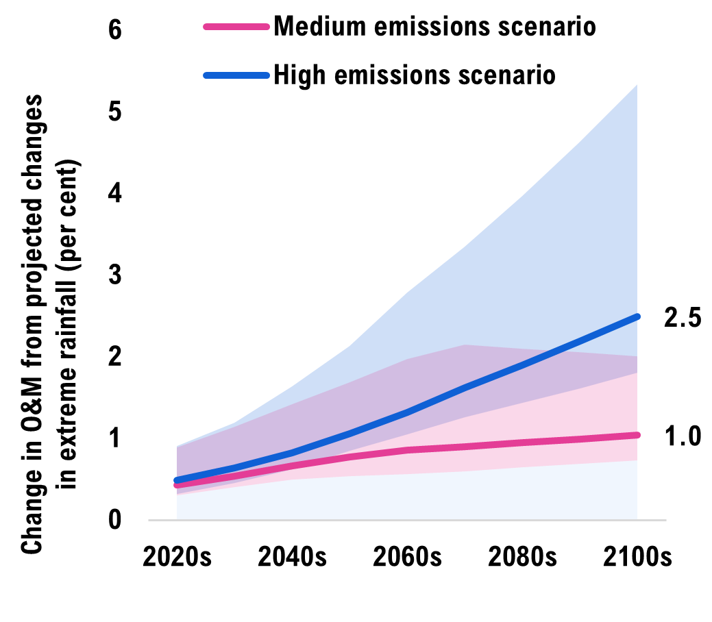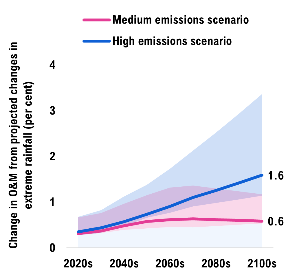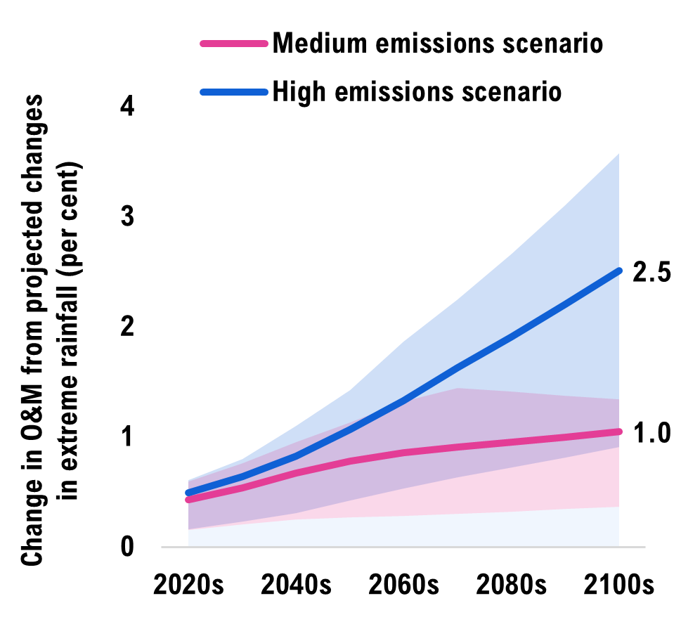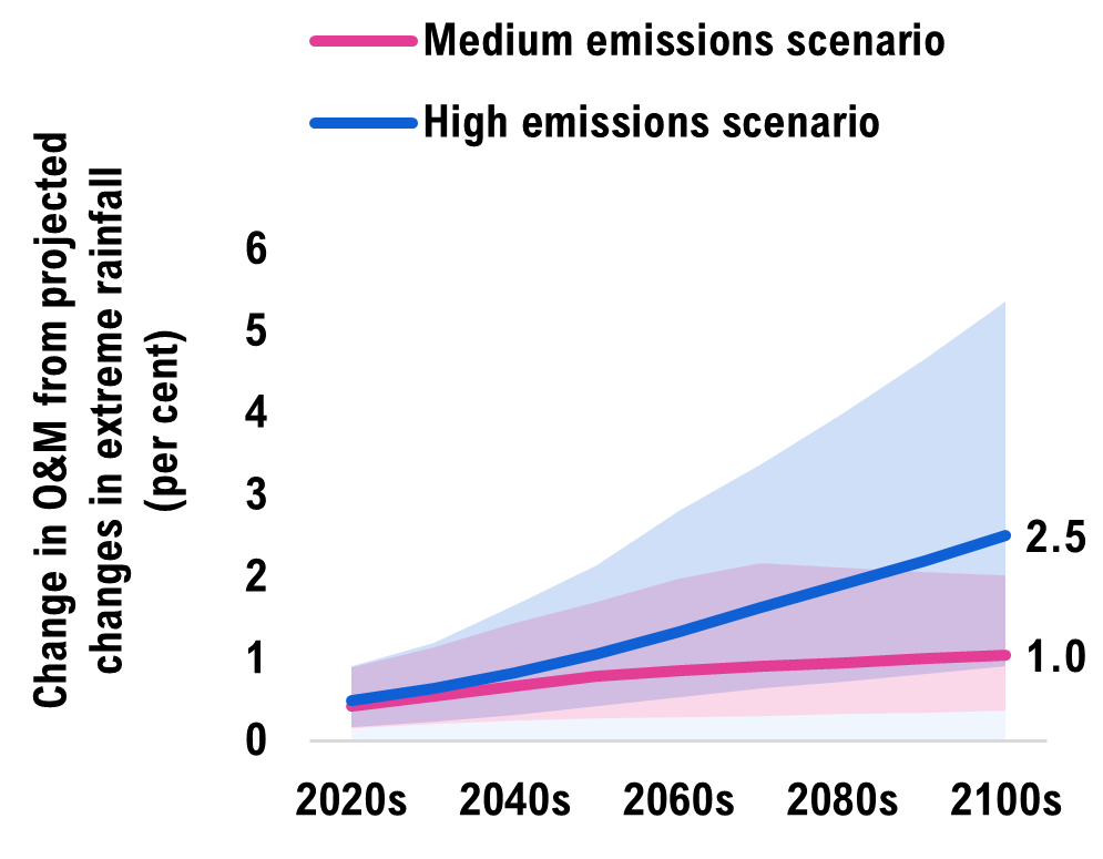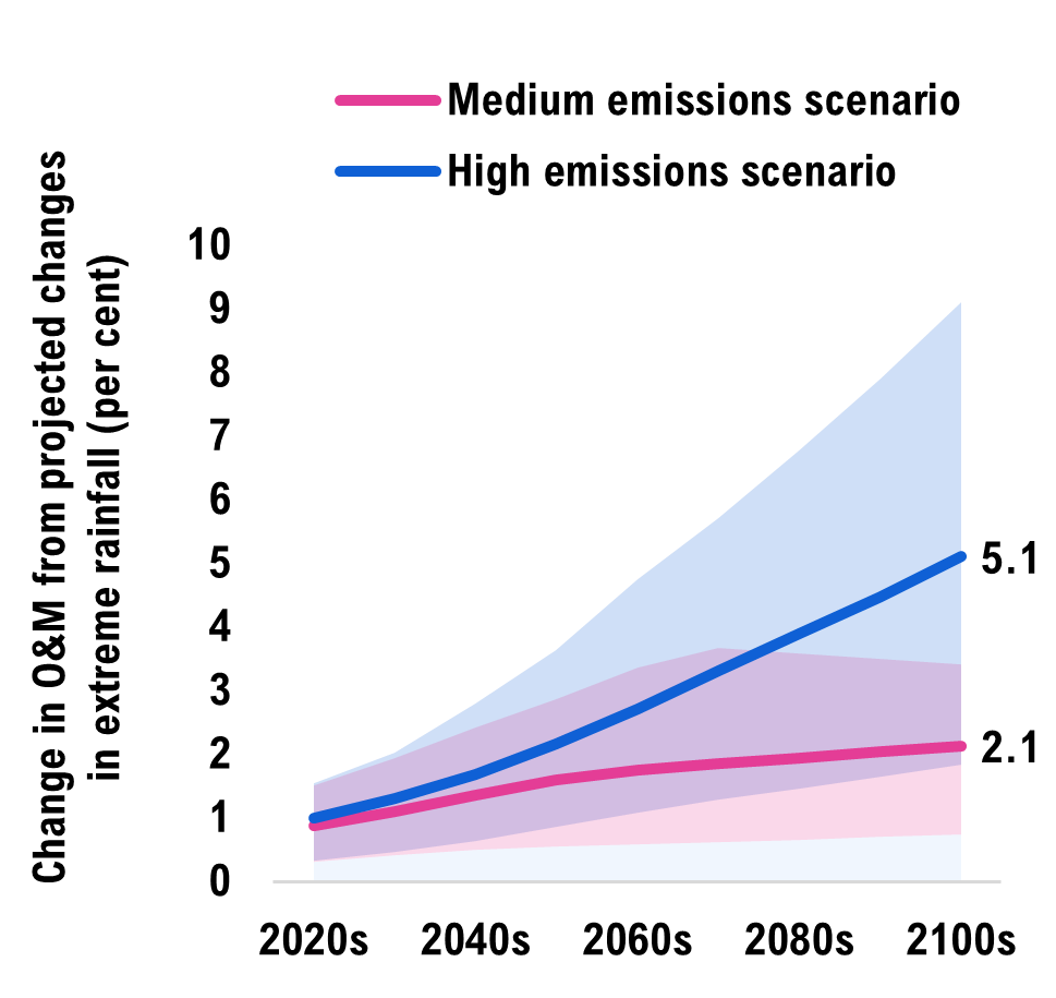 In a medium emissions scenario where global emissions peak by mid-century, more extreme rainfall would increase infrastructure costs by an average of $1.1 billion per year, totalling $88 billion in climate-related costs by 2100. This is a 37 per cent increase in costs relative to the stable climate scenario. In the high emissions scenario, where global emissions continue rising throughout the century, infrastructure costs would instead increase by $1.8 billion per year on average, totalling $145 billion by 2100 (a 61 per cent increase). These additional climate-related costs primarily arise from the higher operations and maintenance expenses required.