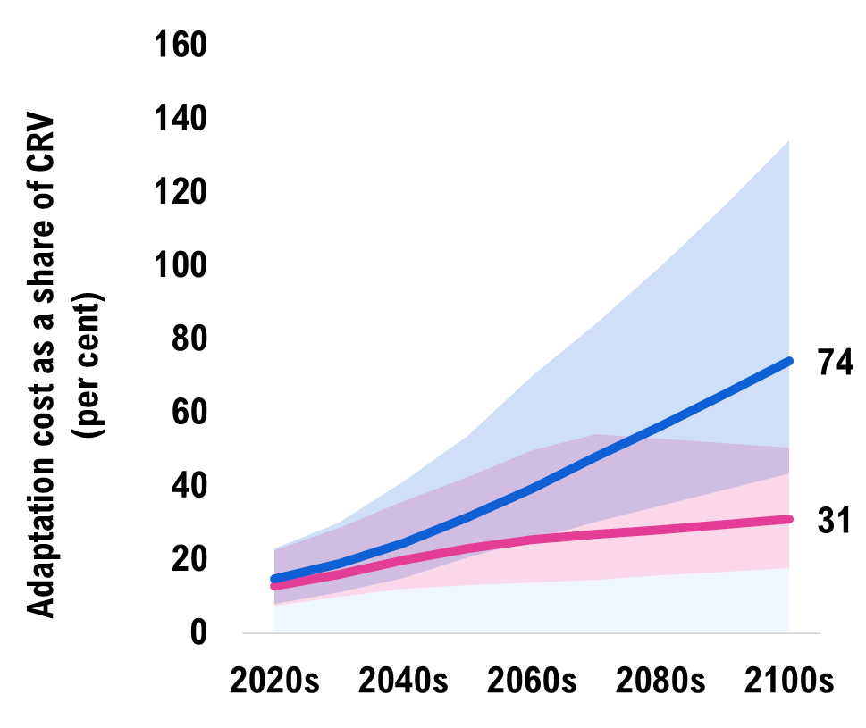 Climate-related infrastructure costs will depend on the future path of global emissions, the pace of adaptation, and the specific capacity of storm and wastewater infrastructure to convey more extreme rainfall. The FAO’s study presents median cost projections as well as a range of possible cost outcomes in each scenario that account for this uncertainty.