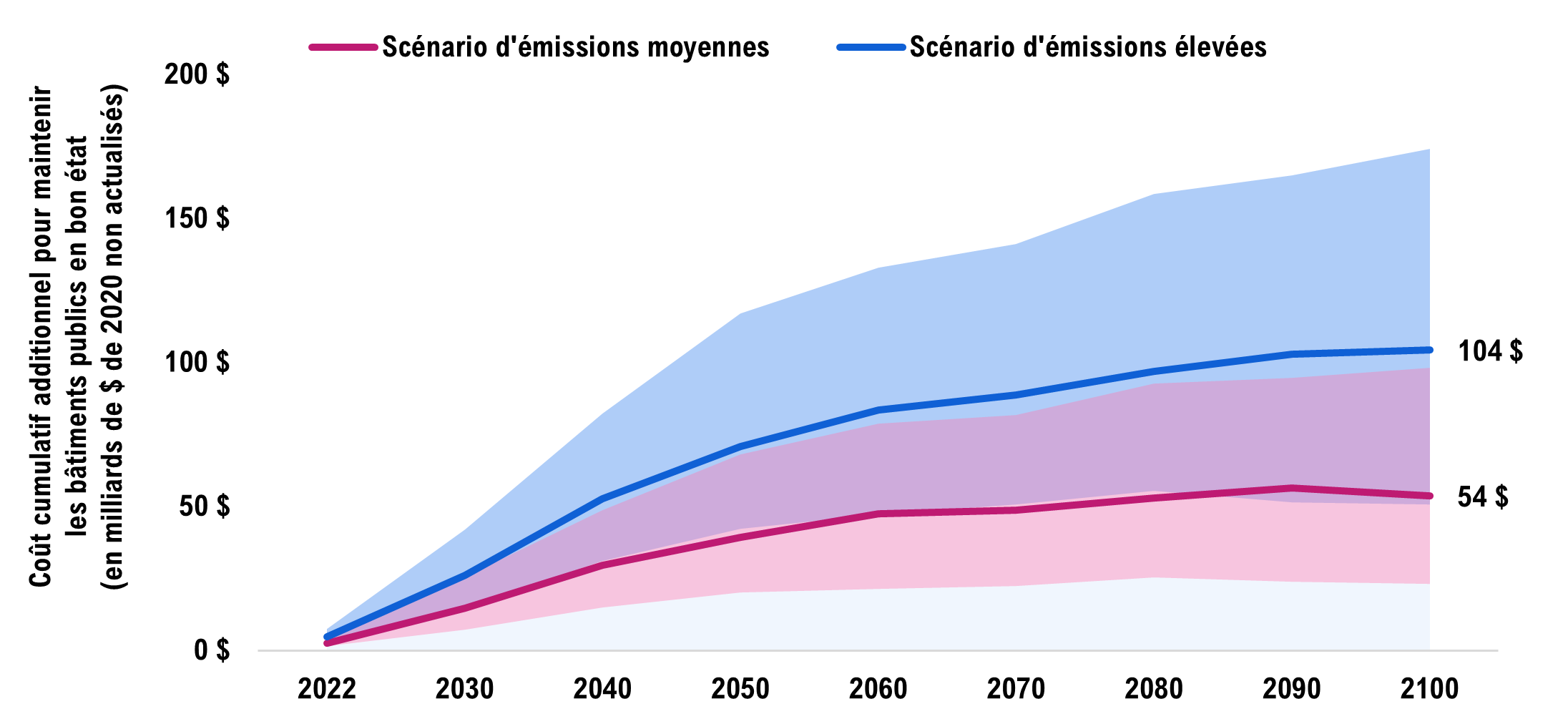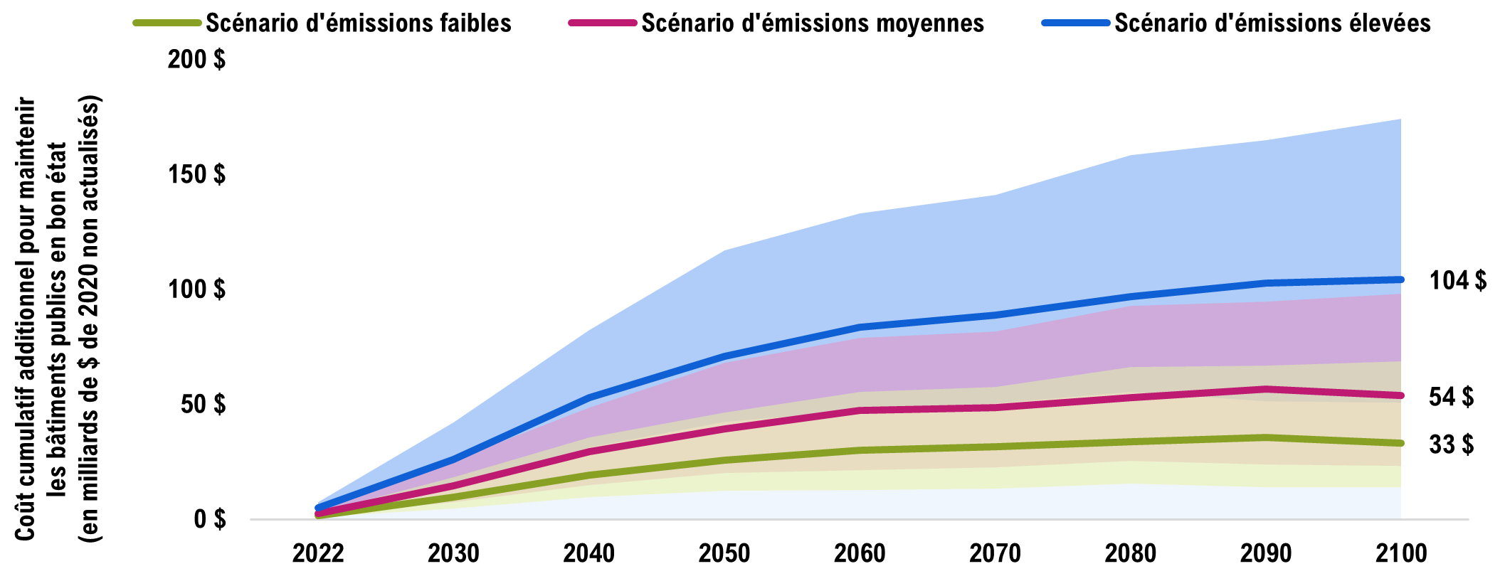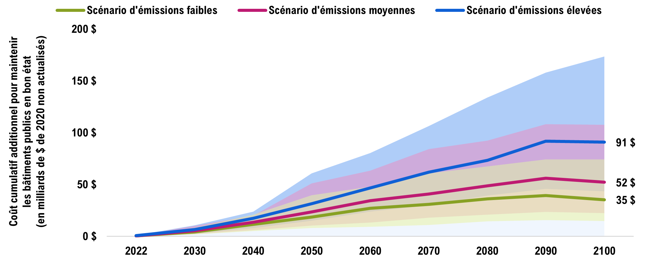 À long terme, l’ampleur du changement climatique à l’échelle mondiale aura une influence sur la gravité de ces dangers climatiques et sur leurs impacts sur les bâtiments publics. Dans un scénario basé sur des émissions moyennes[6], le coût cumulé qu’engendre le maintien en bon état de fonctionnement des bâtiments publics existants augmentera de 66 milliards de dollars (8,2 % d’augmentation par rapport aux coûts de référence), ou 0,8 milliard de dollars par an en moyenne jusqu’à la fin du 21e siècle. Cependant, selon un scénario basé sur des émissions élevées[7], les coûts cumulés augmenteraient de 116 milliards de dollars (14,5 % d’augmentation par rapport aux coûts de référence), ou 1,5 milliard de dollars par an en moyenne jusqu’à la fin du siècle. Ces résultats se traduiront par une augmentation des dépenses en immobilisation en raison de l’accélération de la détérioration et de la hausse des dépenses d’E et E.