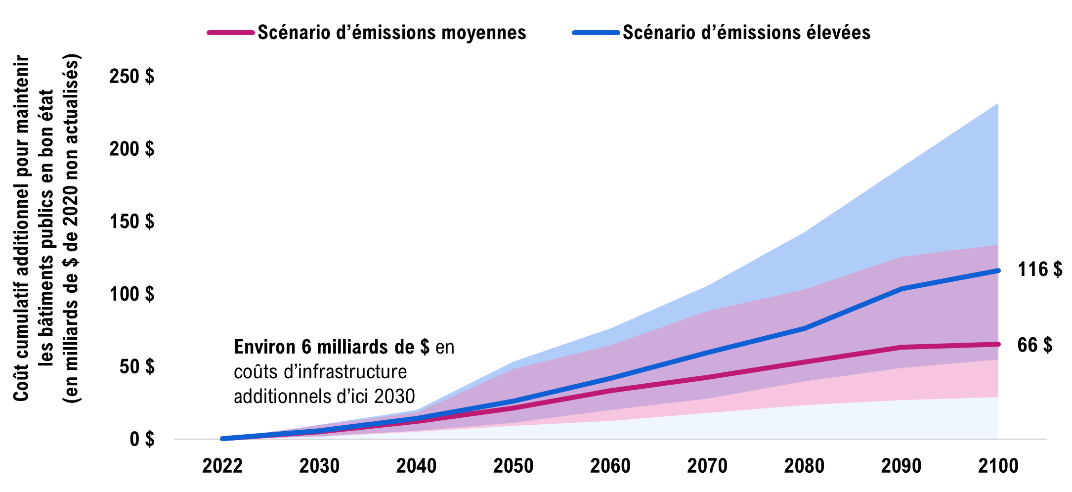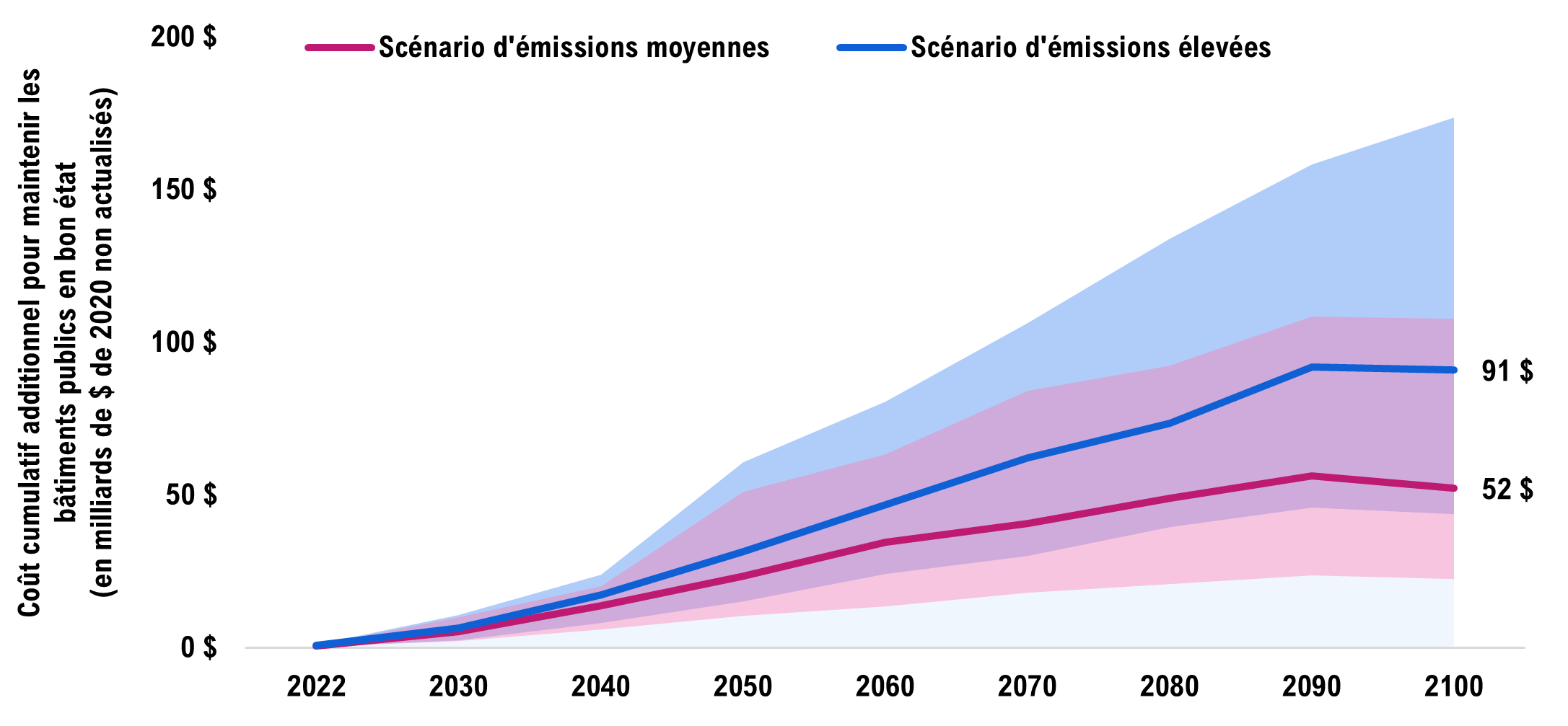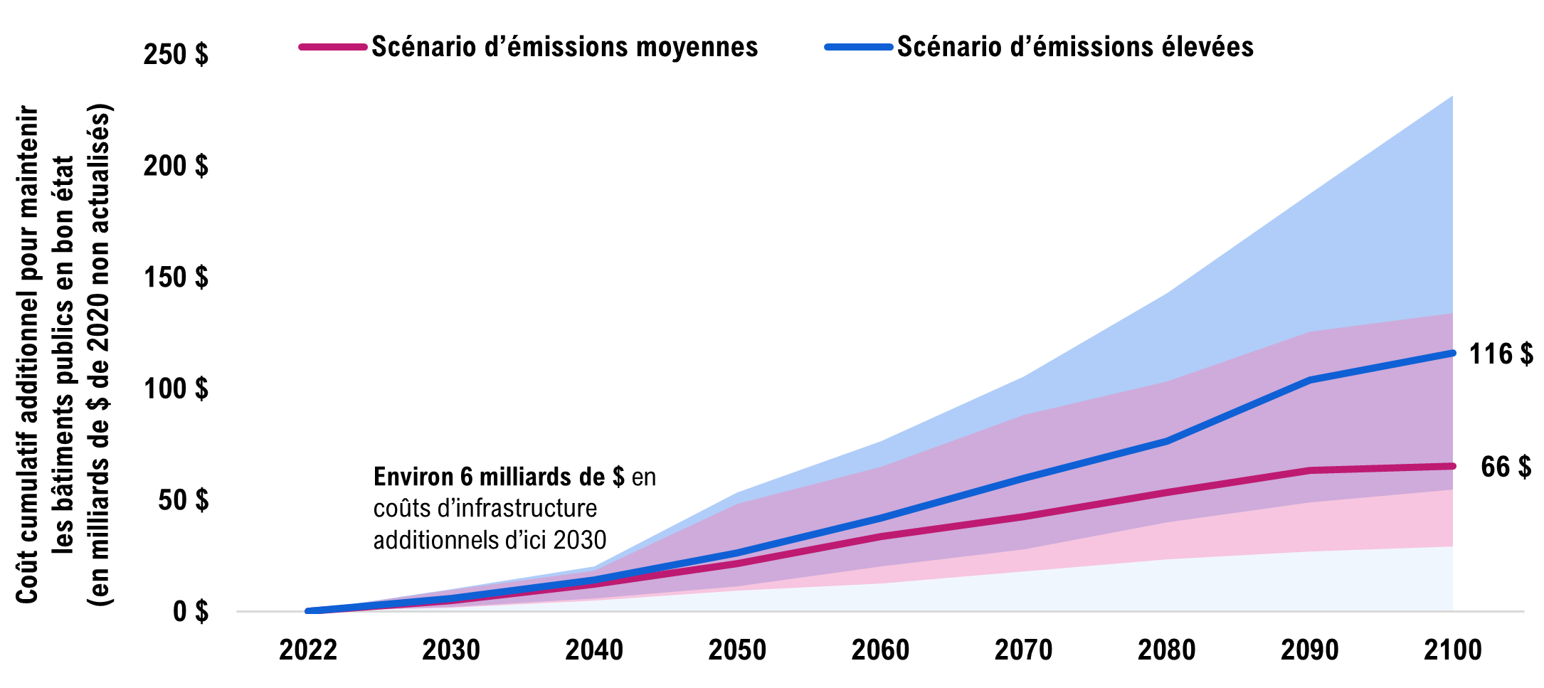 À long terme, l’ampleur du changement climatique à l’échelle mondiale aura une influence sur la gravité de ces dangers climatiques et sur leurs impacts sur les bâtiments publics. Dans un scénario basé sur des émissions moyennes[6], le coût cumulé qu’engendre le maintien en bon état de fonctionnement des bâtiments publics existants augmentera de 66 milliards de dollars (8,2 % d’augmentation par rapport aux coûts de référence), ou 0,8 milliard de dollars par an en moyenne jusqu’à la fin du 21e siècle. Cependant, selon un scénario basé sur des émissions élevées[7], les coûts cumulés augmenteraient de 116 milliards de dollars (14,5 % d’augmentation par rapport aux coûts de référence), ou 1,5 milliard de dollars par an en moyenne jusqu’à la fin du siècle. Ces résultats se traduiront par une augmentation des dépenses en immobilisation en raison de l’accélération de la détérioration et de la hausse des dépenses d’E et E.