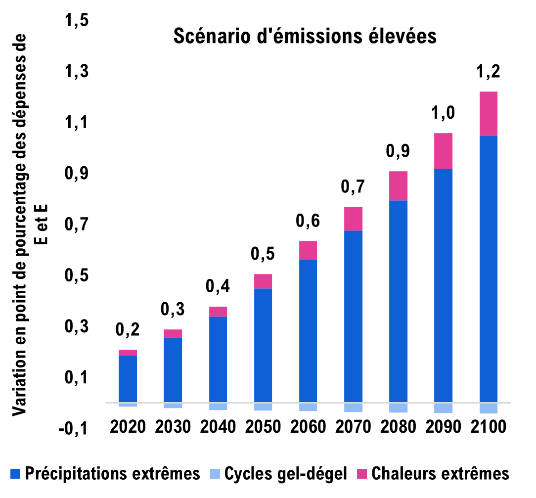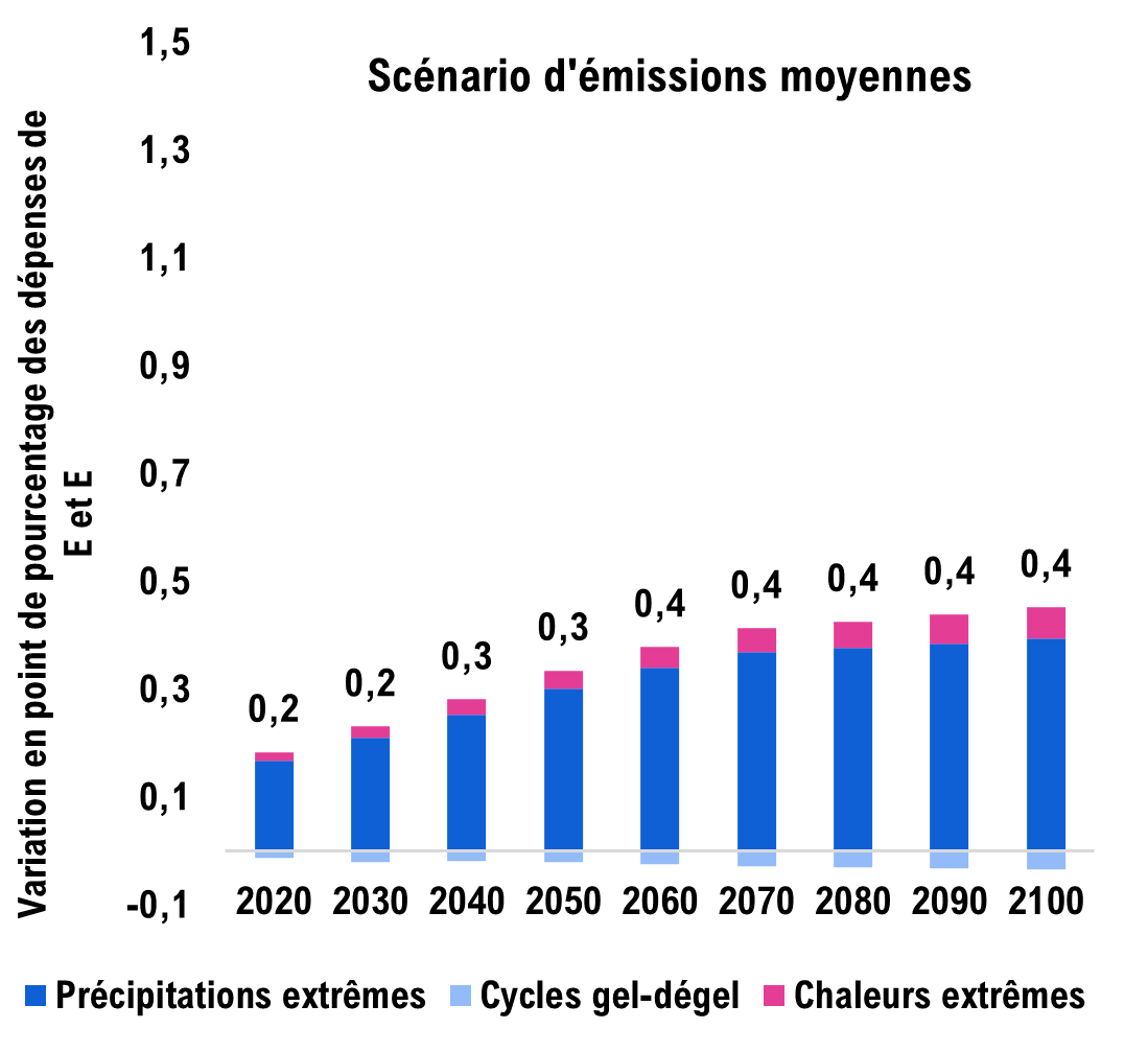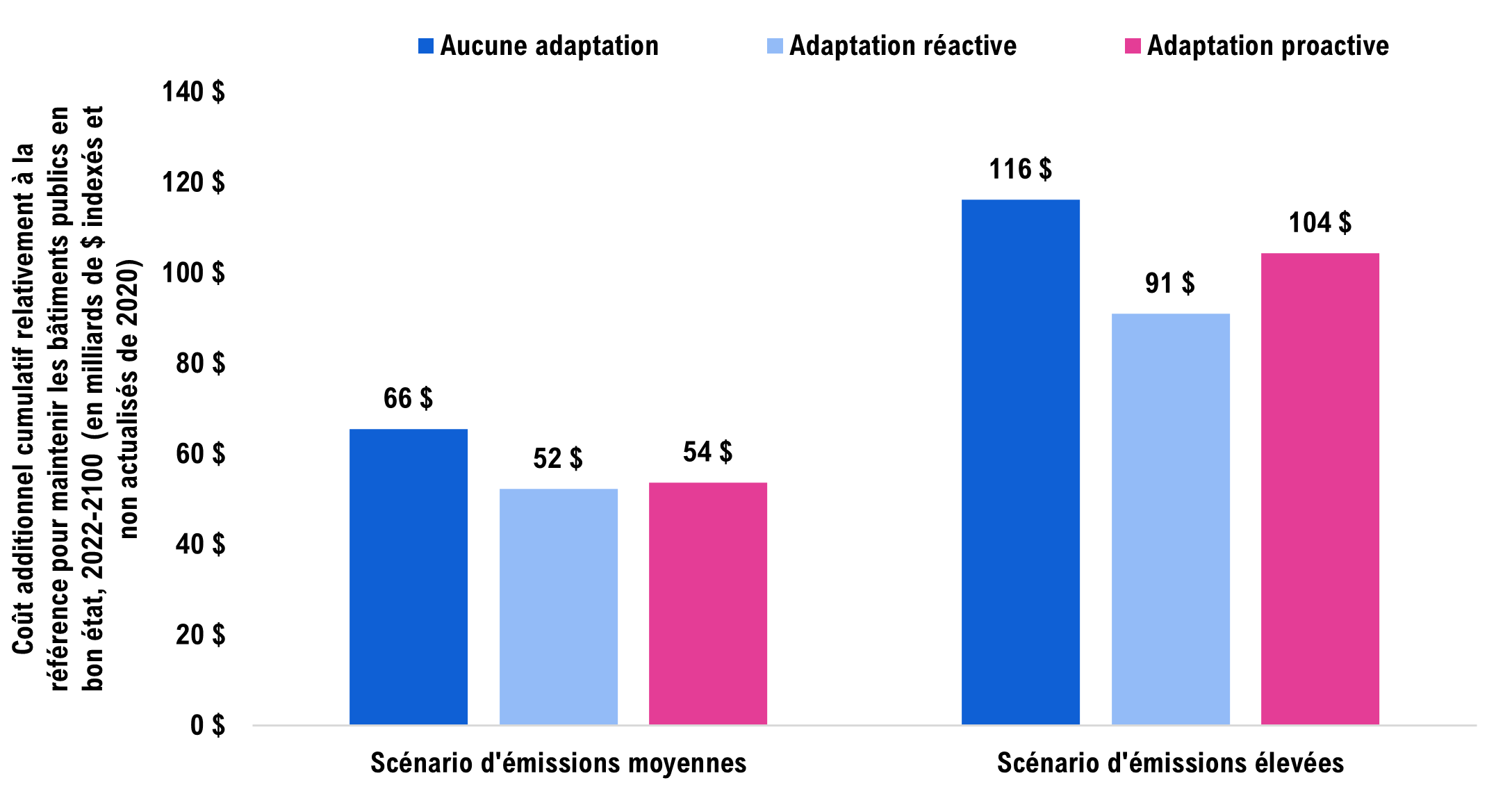 Graphique 2-1 En l’absence de mesures d’adaptation, la multiplication des épisodes de précipitations et de chaleurs extrêmes fera augmenter le coût d’entretien des bâtiments publics existants