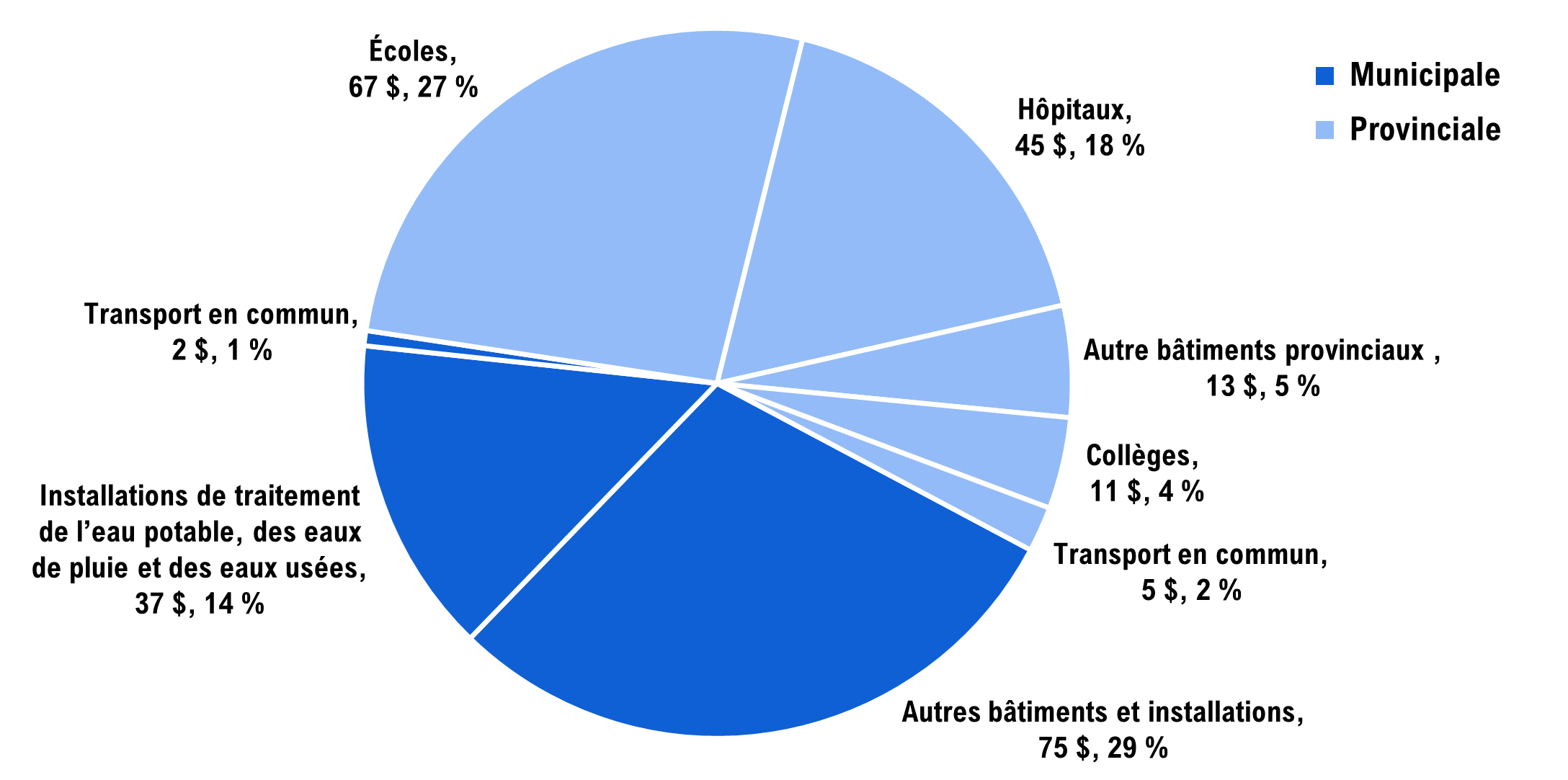 Les bâtiments et installations publics appartenant au gouvernement provincial représentent une valeur de 141 milliards de dollars (55 %) et les autres biens, représentant 113 milliards de dollars (45 %), appartiennent aux municipalités de l’Ontario[15]. Les biens provinciaux comprennent :